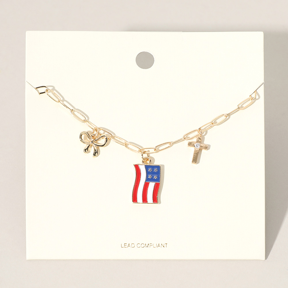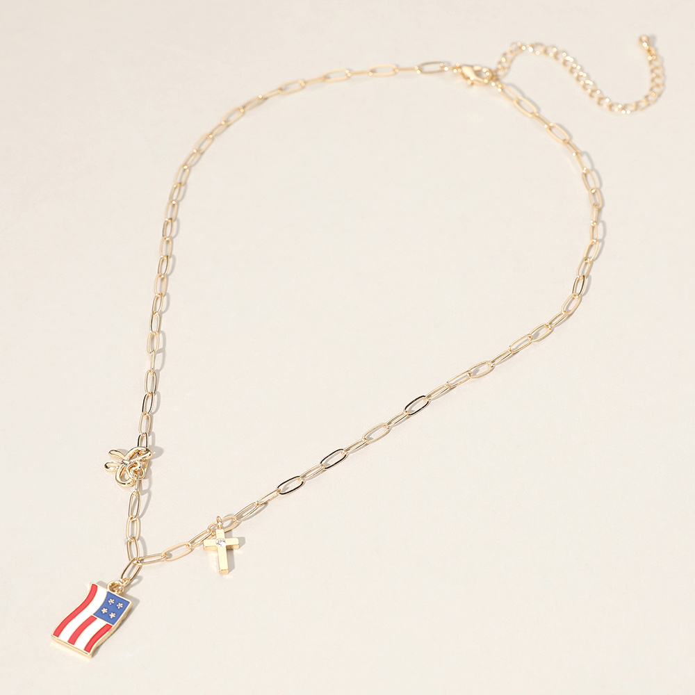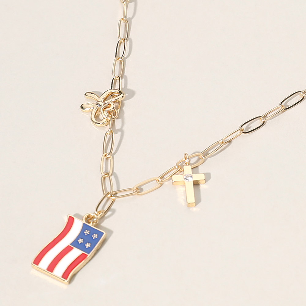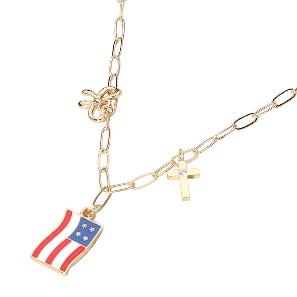 Enamel American USA Flag Metal Cross Bow Charm Station Paperclip Chain Necklace