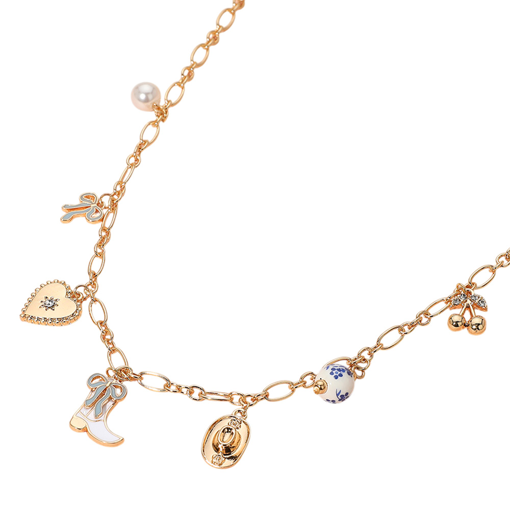 Details • Necklace Size : 16" + 3.5" L • Decor Size : 0.8" L • Add playful elegance to your style with this whimsical charm necklace featuring a mix of delicate pendants including a heart, boot, cherry, and floral bead. Perfect for everyday wear or as a standout piece, it blends fun and sophistication in a unique accessory. • Lead and Nickel Compliant