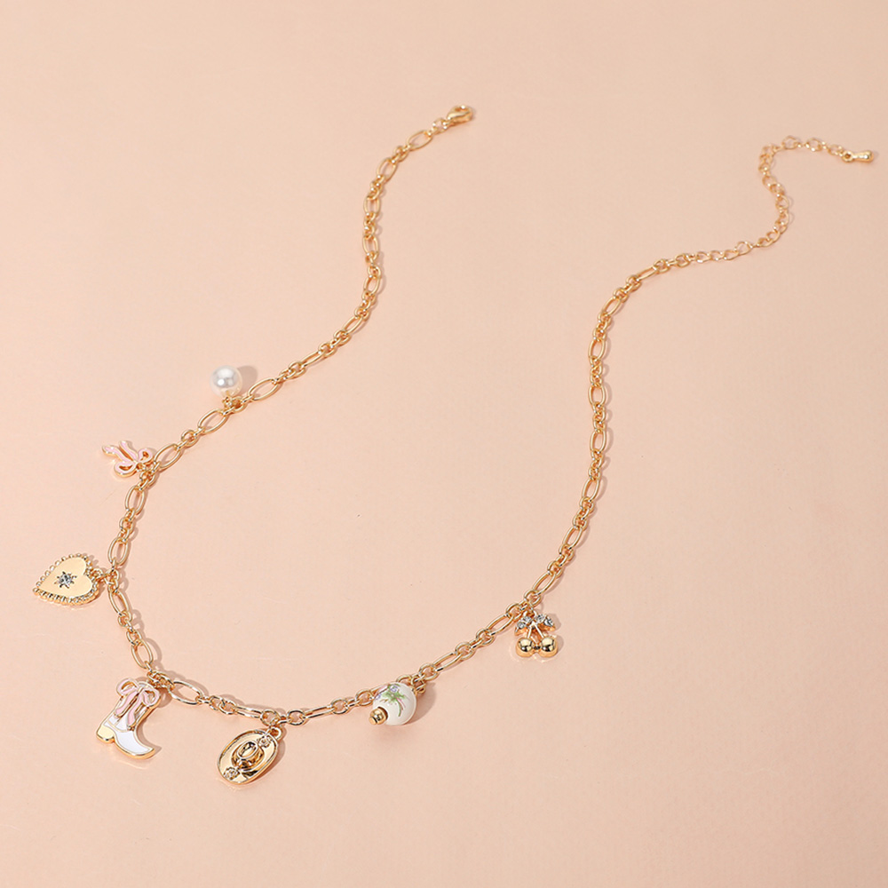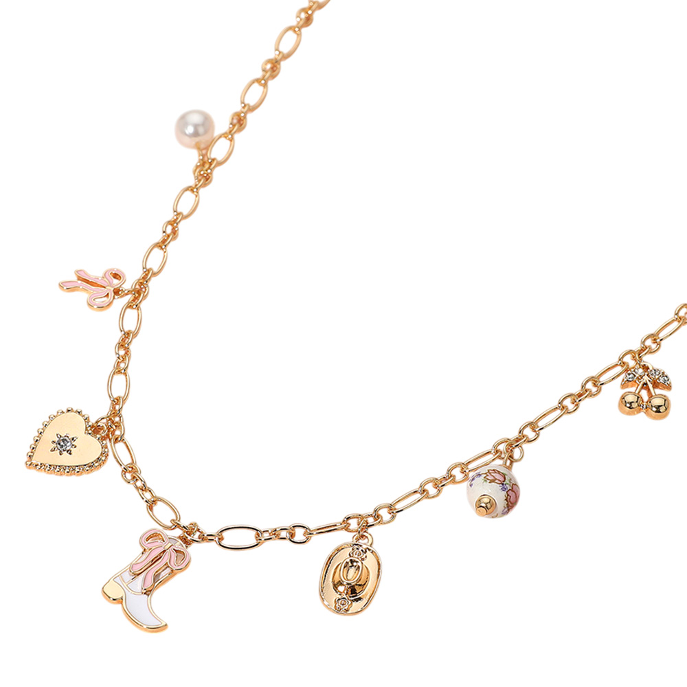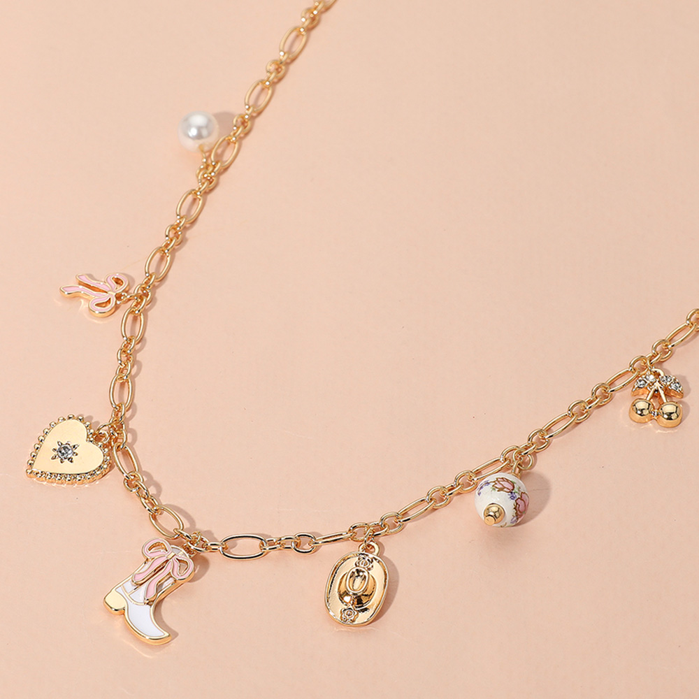 Enamel Bow Western Cowboy Boot Hat Heart Ceramic Ball Pearl Cherry Charm Station Necklace