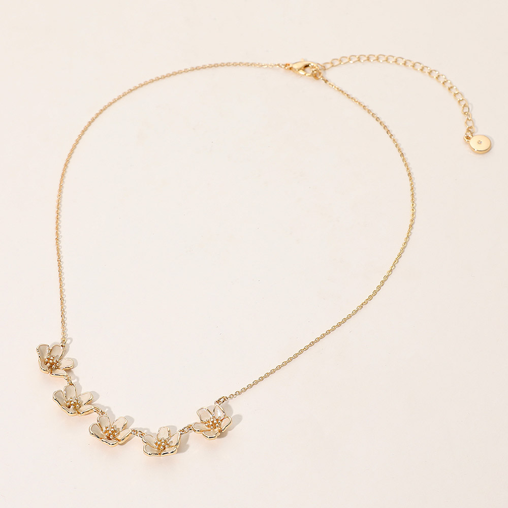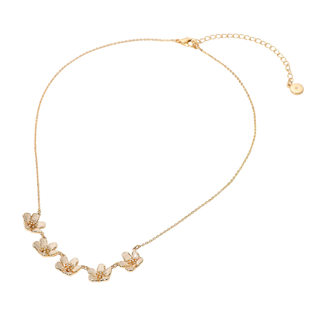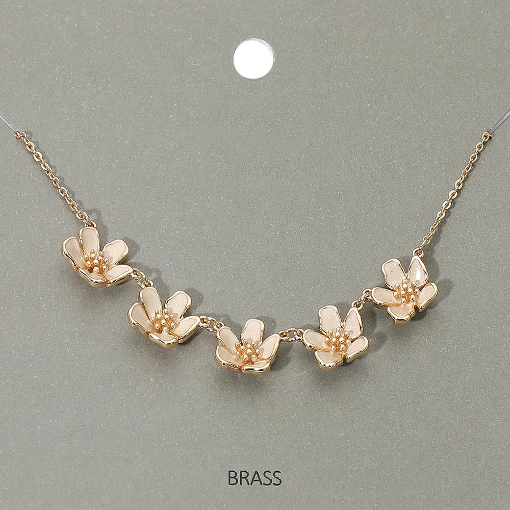 Details • Necklace Size : 16" + 3" L • Decor Size : 0.4" L • Elevate everyday style with the Floral Charm Station Necklace, featuring a series of delicate blossom accents set along a fine chain for graceful movement and subtle sparkle. Perfect for layering or wearing solo as a feminine statement piece. • Brass • Lead and Nickel Compliant