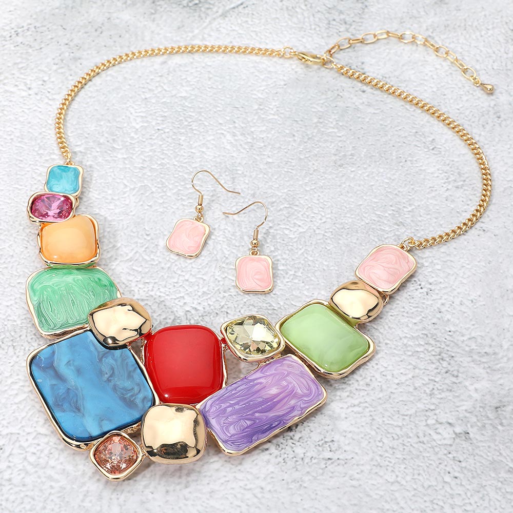 Details • Necklace Size : 18" + 3.5" L • Decor Size : 2.5" L • Earrings Size : 1.4" L • Modern statement necklace and earrings set featuring a mosaic of enamel geometric plate accents framed in metallic trim. The bold mix of smooth and marbled textures adds artistic flair, making it a standout accessory for elegant or contemporary fashion ensembles. • Lead and Nickel Compliant