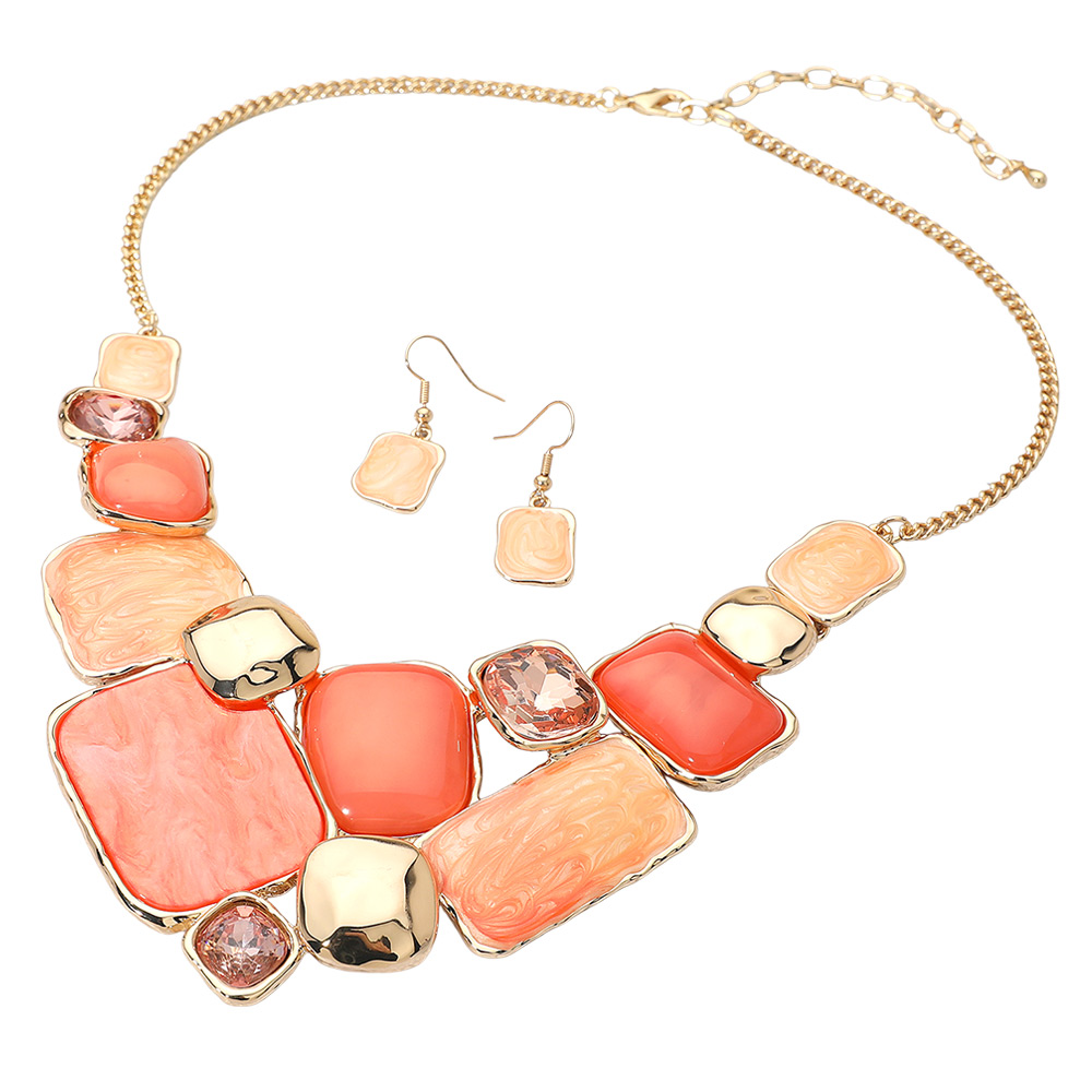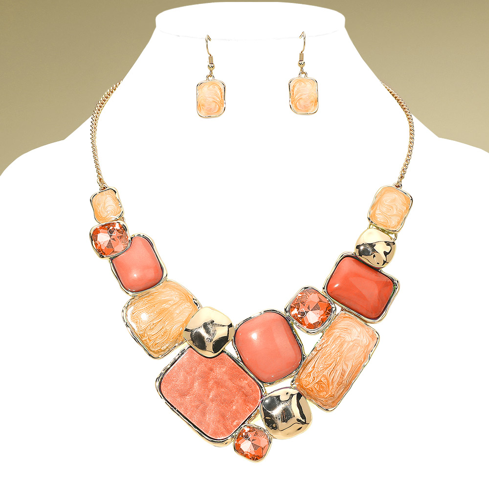 • Modern statement necklace and earrings set featuring a mosaic of enamel geometric plate accents framed in metallic trim. The bold mix of smooth and marbled textures adds artistic flair, making it a standout accessory for elegant or contemporary fashion ensembles.