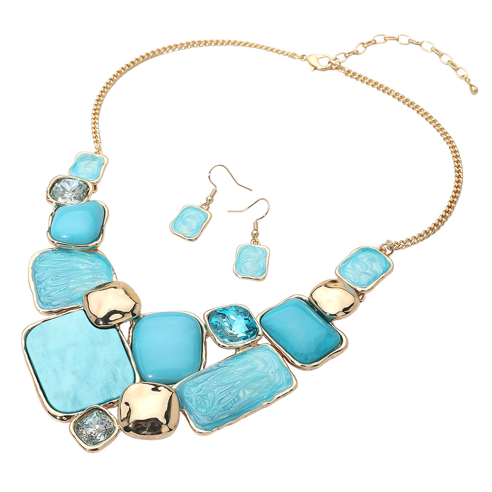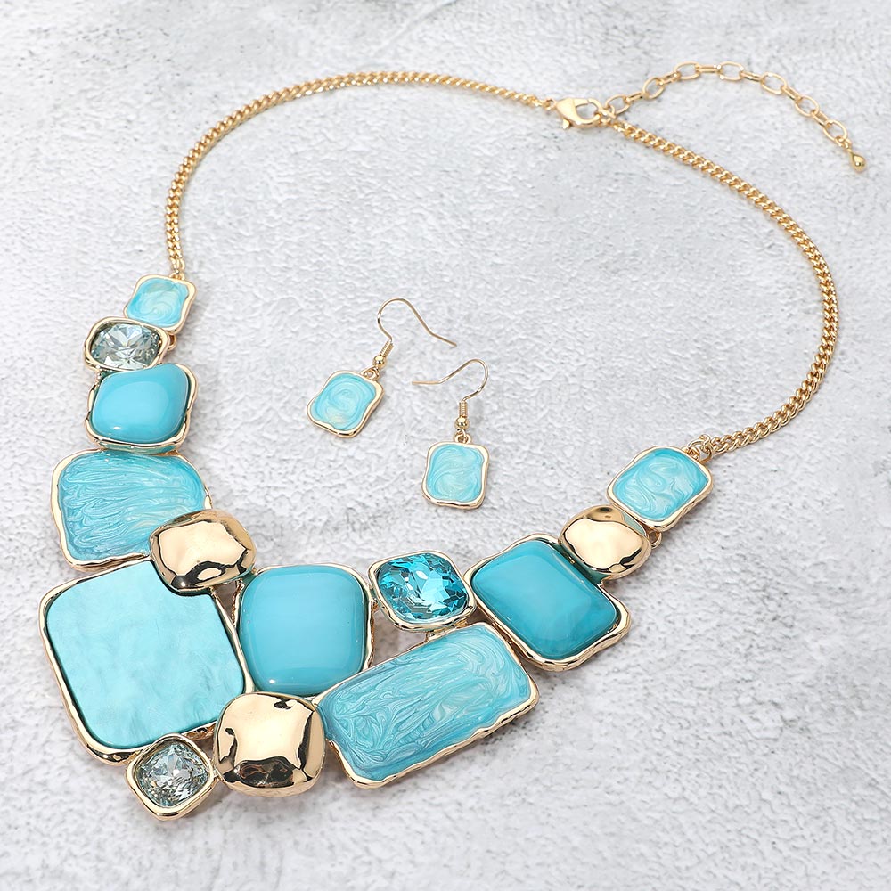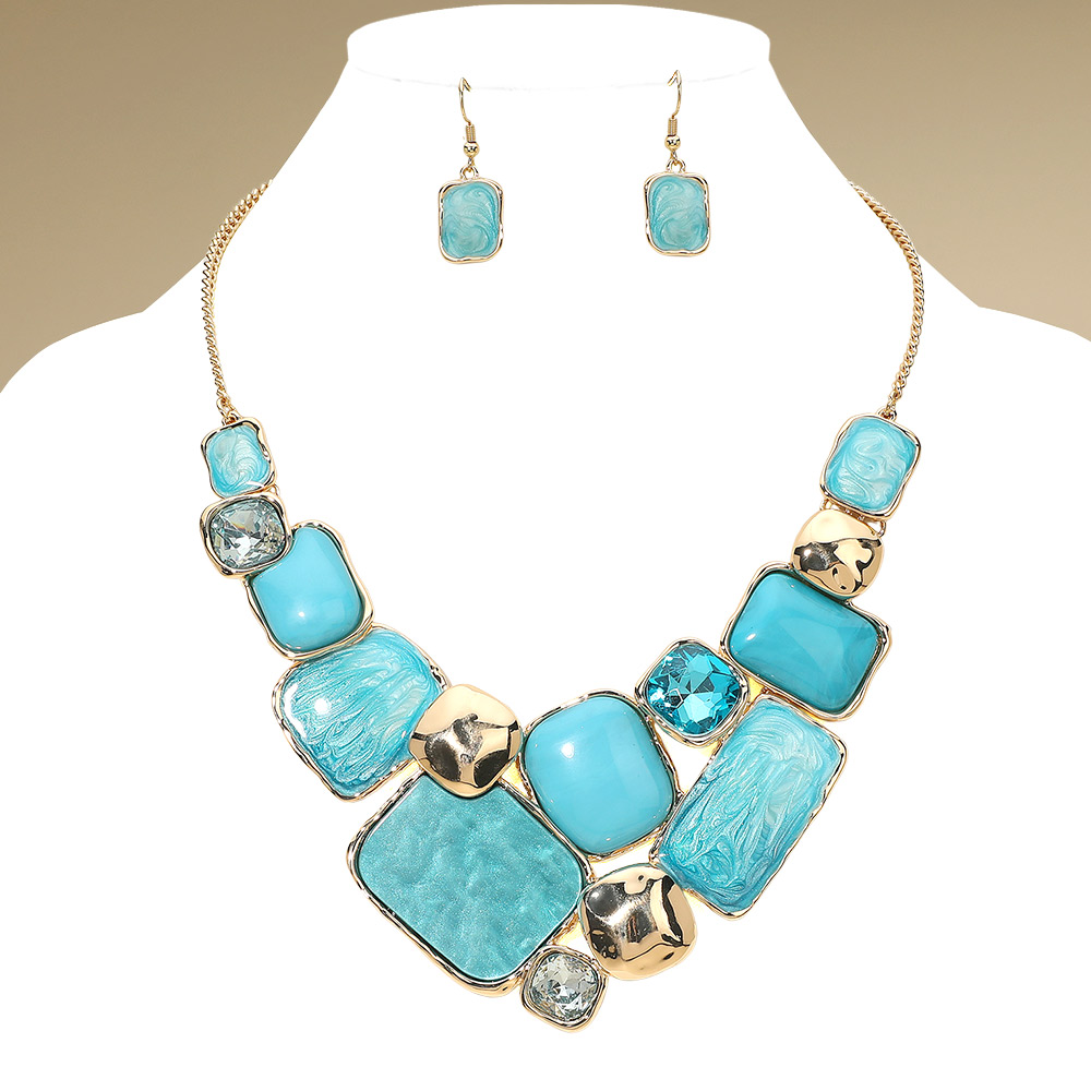 • Modern statement necklace and earrings set featuring a mosaic of enamel geometric plate accents framed in metallic trim. The bold mix of smooth and marbled textures adds artistic flair, making it a standout accessory for elegant or contemporary fashion ensembles.