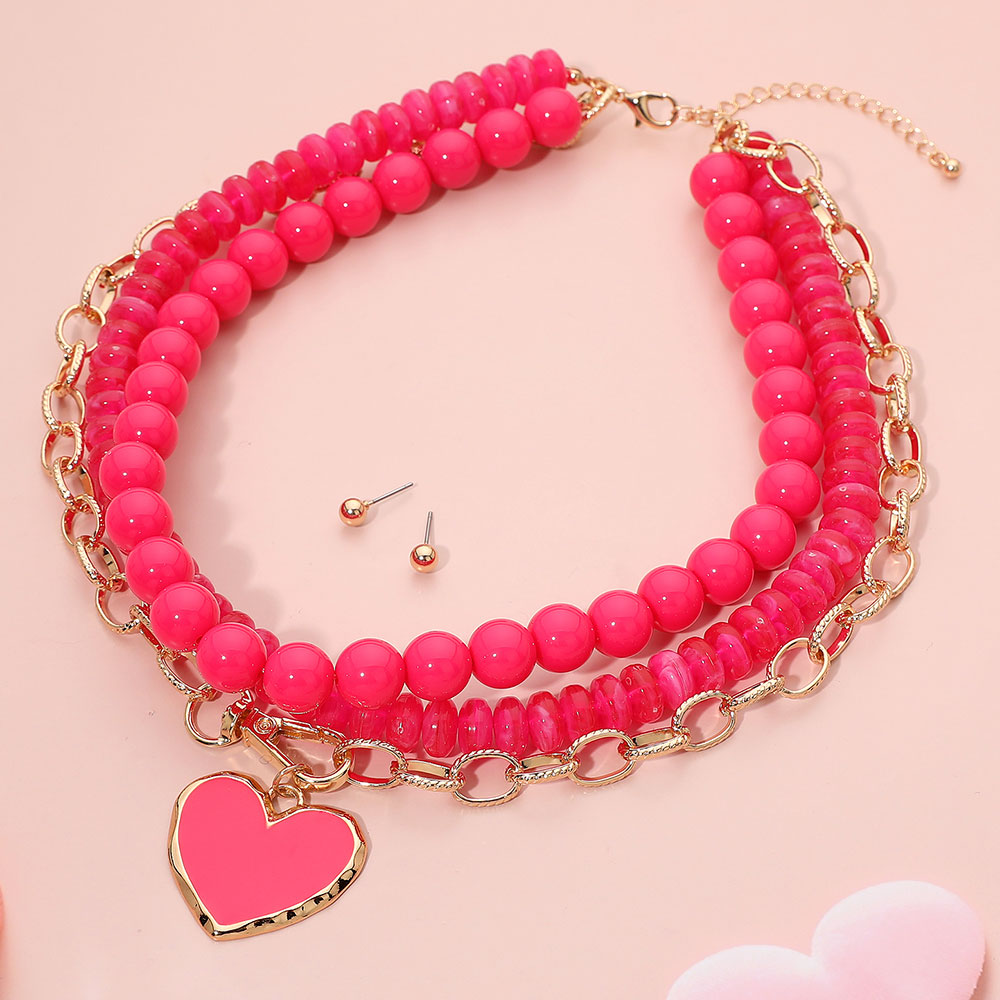 Enamel Heart Pendant Accent Chunky Beaded Layered Statement Necklace