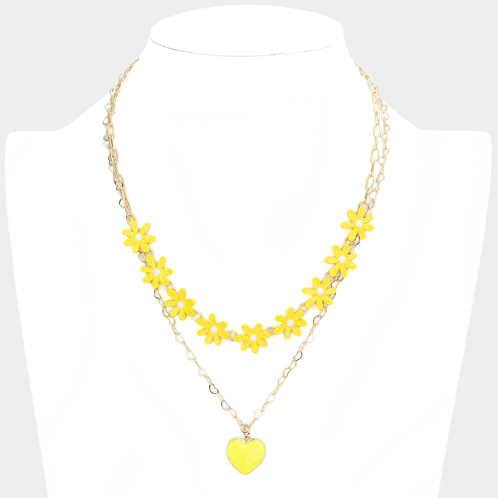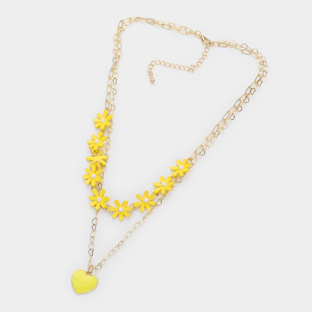 Enamel Heart Pendant Flower Link Double Layered Necklace