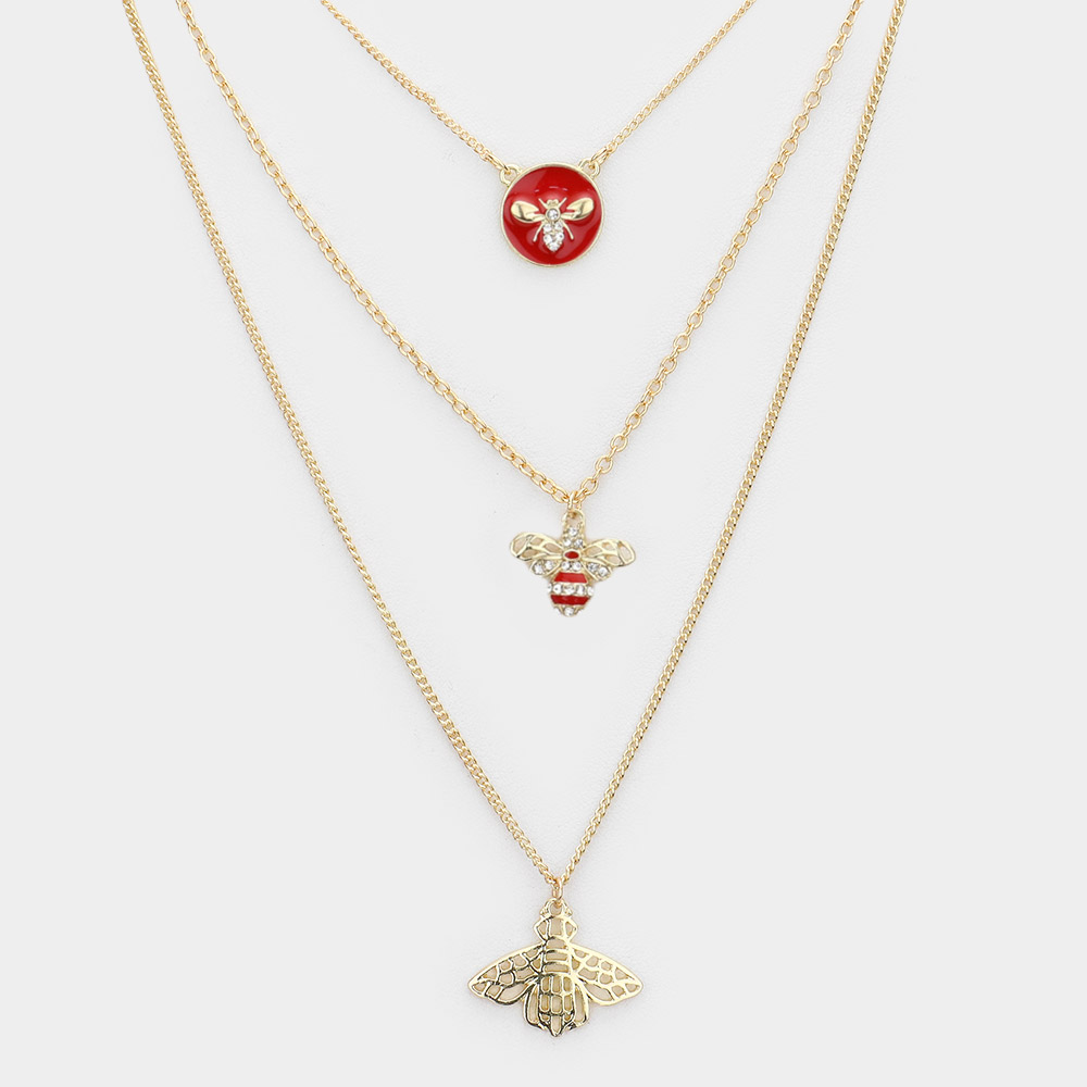 Enamel Rhinestone Embellished Honey Bee Pendant Triple Layered Necklace
