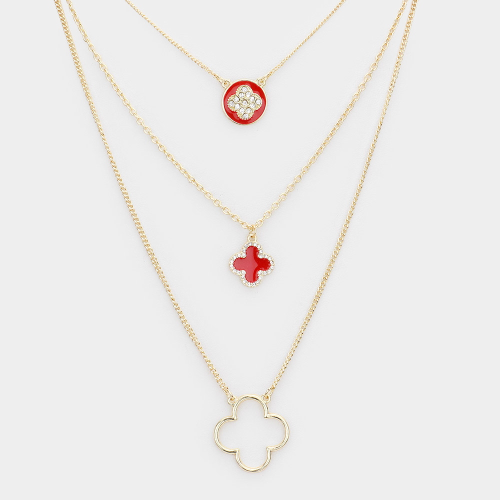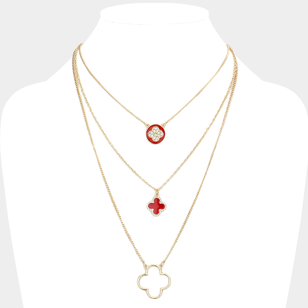 Enamel Rhinestone Embellished Quatrefoil Pendant Triple Layered Necklace