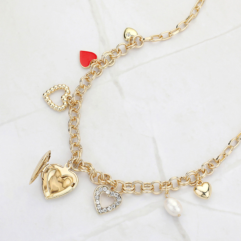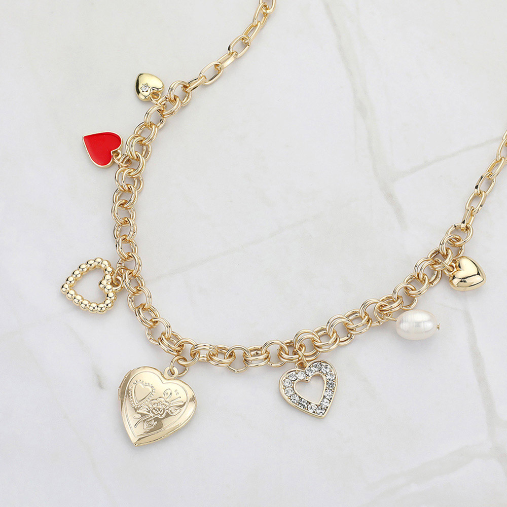 Enamel Stone Paved Metal Heart Pearl Charm Station Necklace