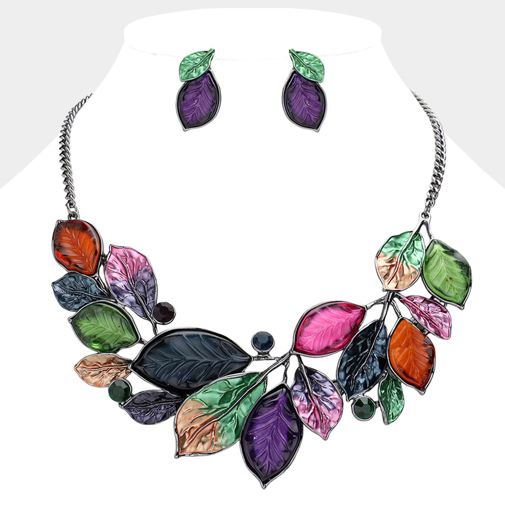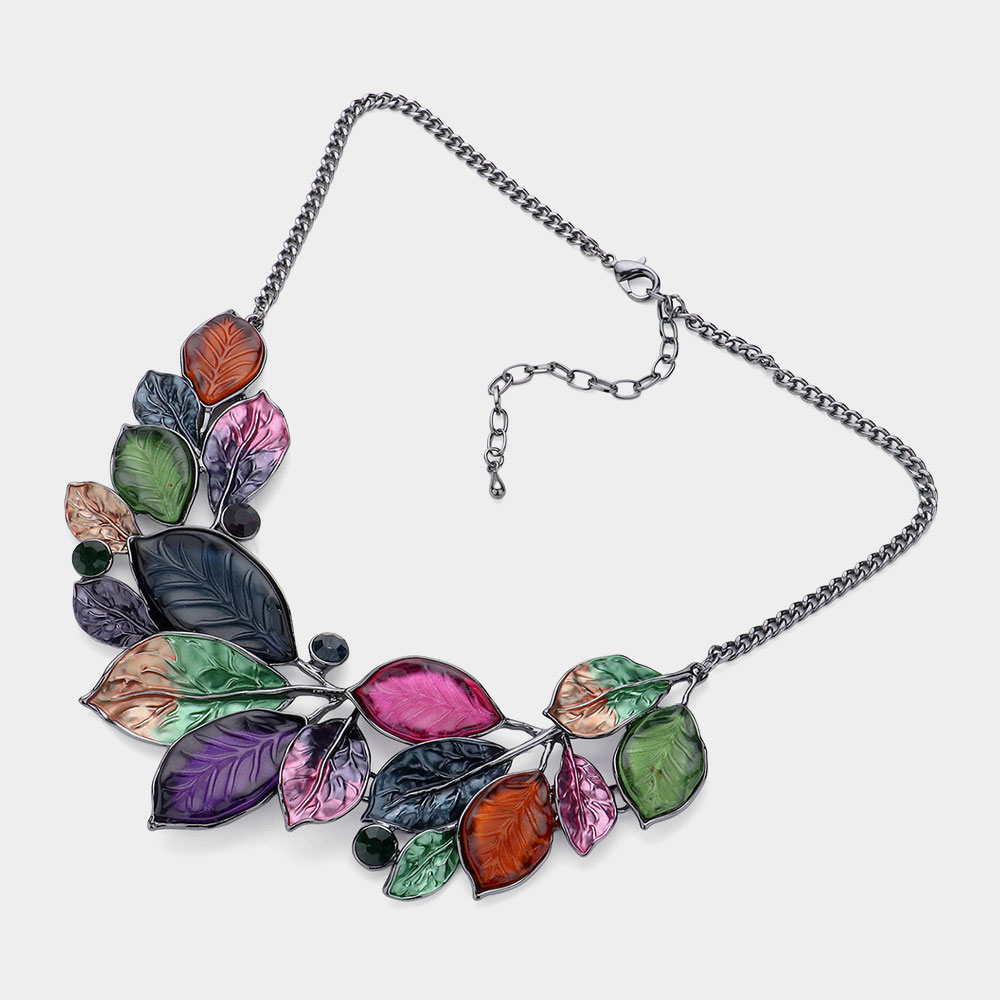 Details • Necklace Size : 16.5" + 3.5" L • Decor Size : 2" L • Earrings Size : 1.2" L • Turn heads with this bold leaf-themed statement necklace and matching earrings set. Designed for standout style, it’s perfect for special occasions or adding flair to everyday looks. A must-have for modern, fashion-forward wardrobes. • Lead and Nickel Compliant