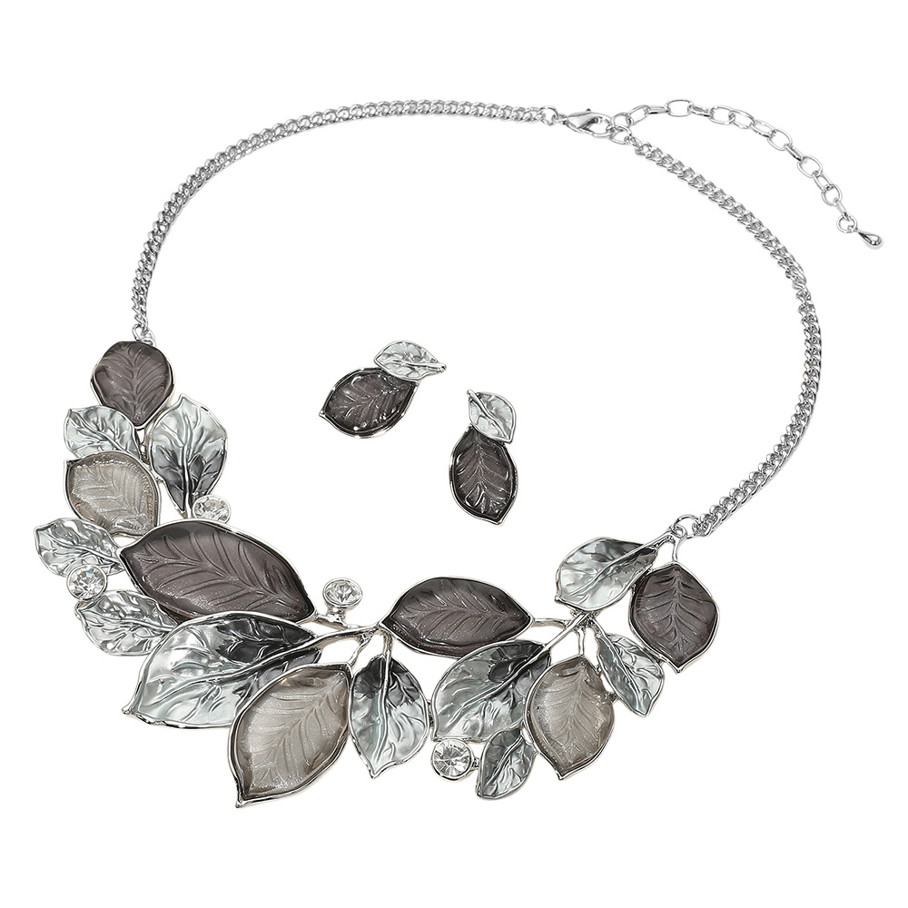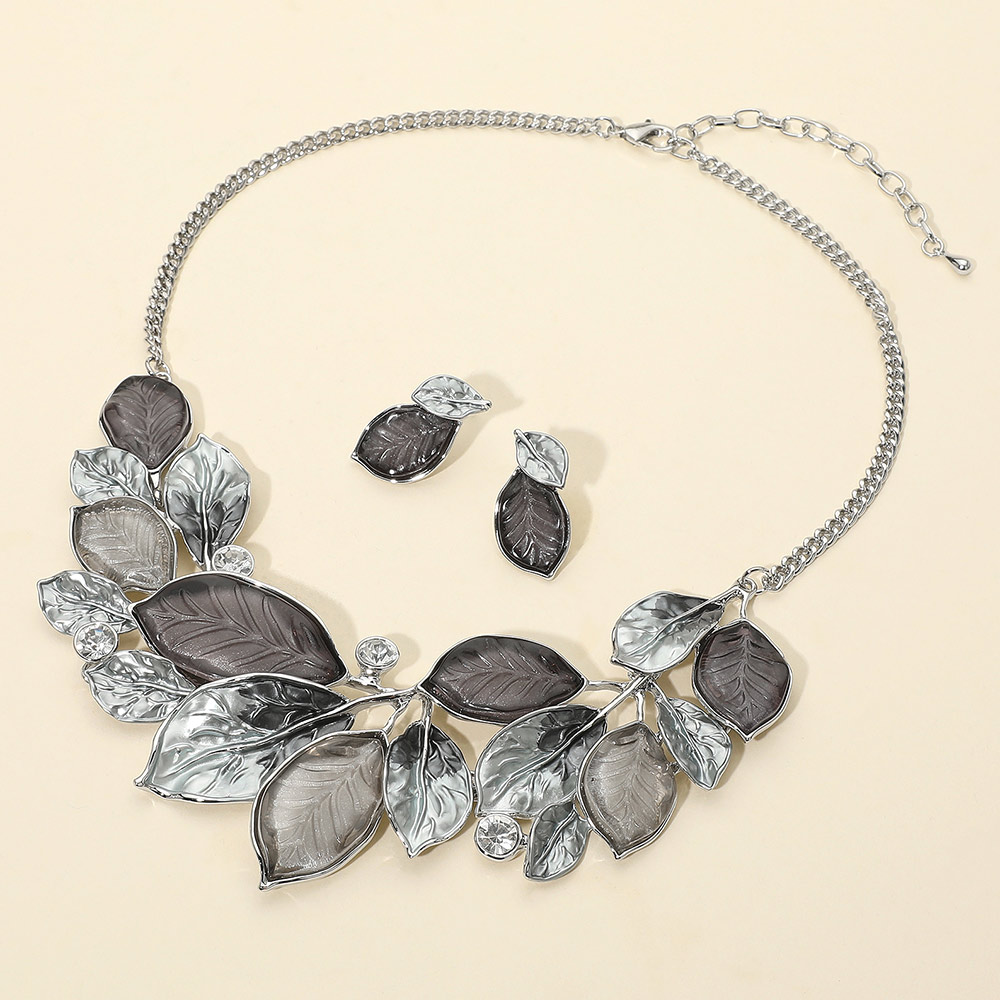 Details • Necklace Size : 16.5" + 3.5" L • Decor Size : 2" L • Earrings Size : 1.2" L • Turn heads with this bold leaf-themed statement necklace and matching earrings set. Designed for standout style, it’s perfect for special occasions or adding flair to everyday looks. A must-have for modern, fashion-forward wardrobes. • Lead and Nickel Compliant