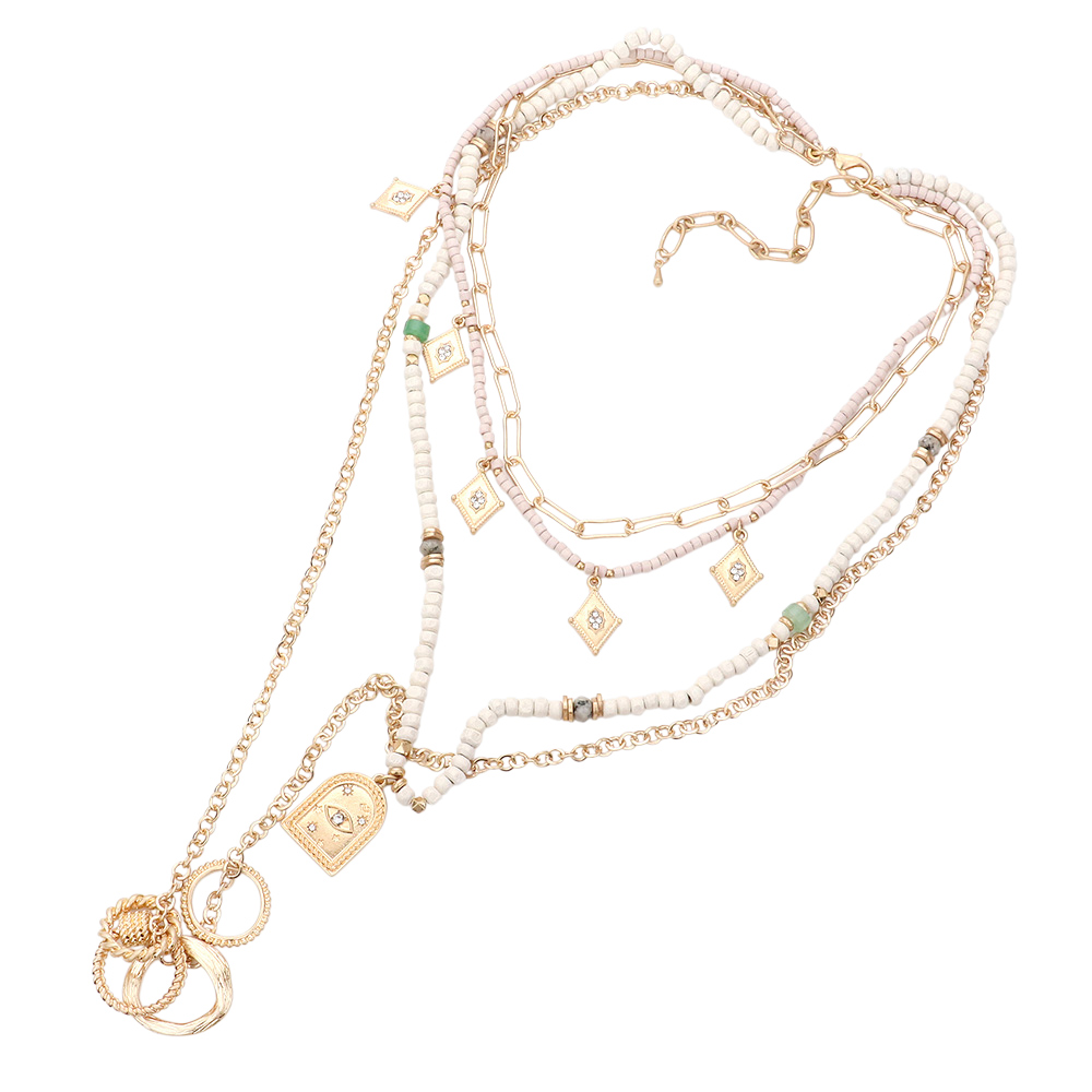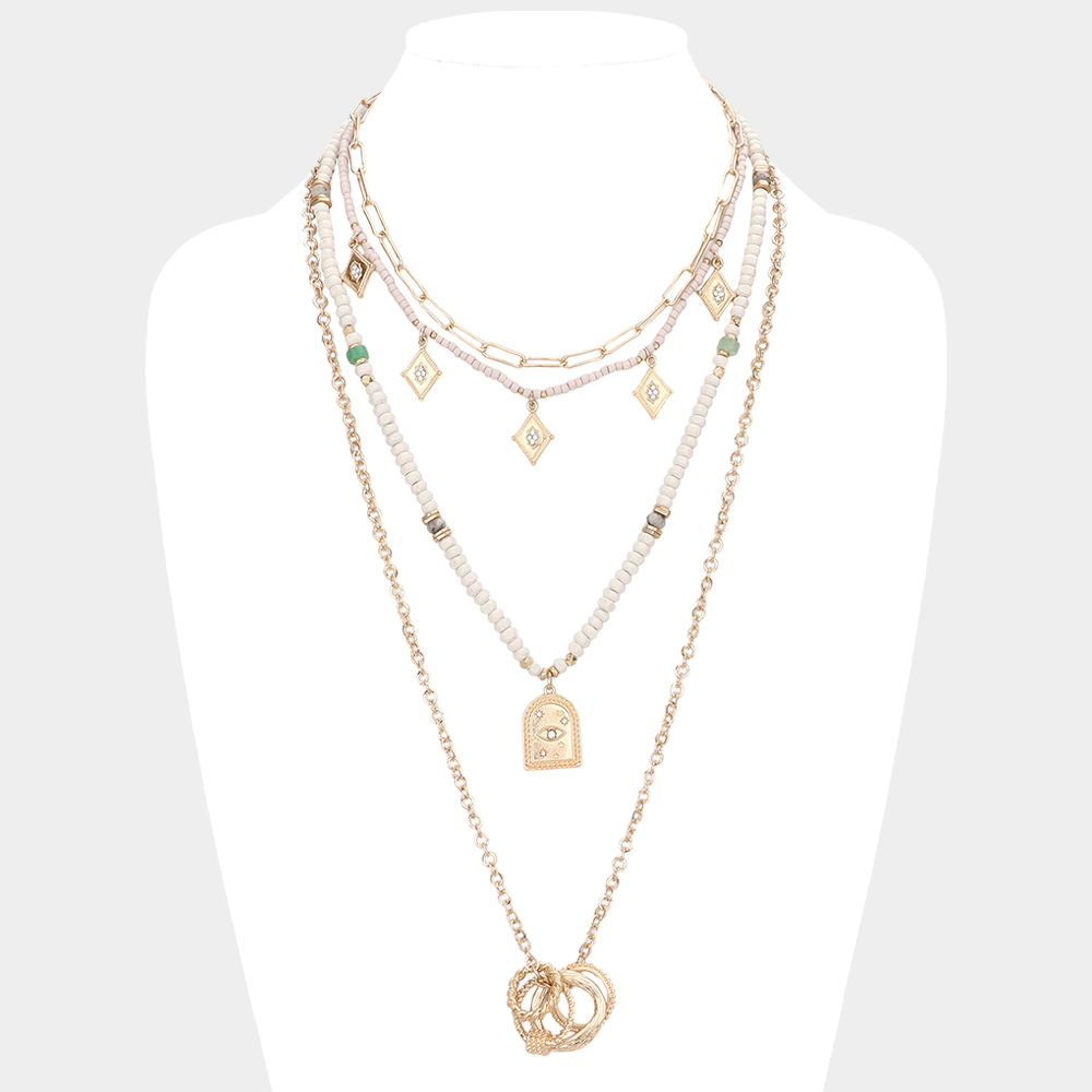 Evil Eye Open Metal Circle Pendant Wood Multi Layered Necklace
