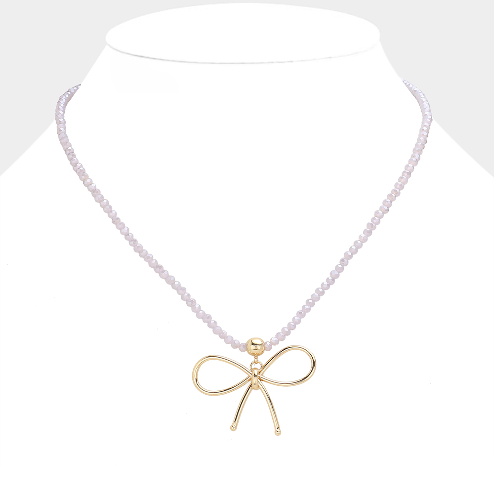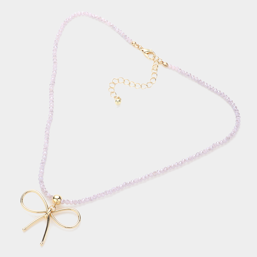 Faceted Beaded Brass Metal Wire Bow Pendant Necklace