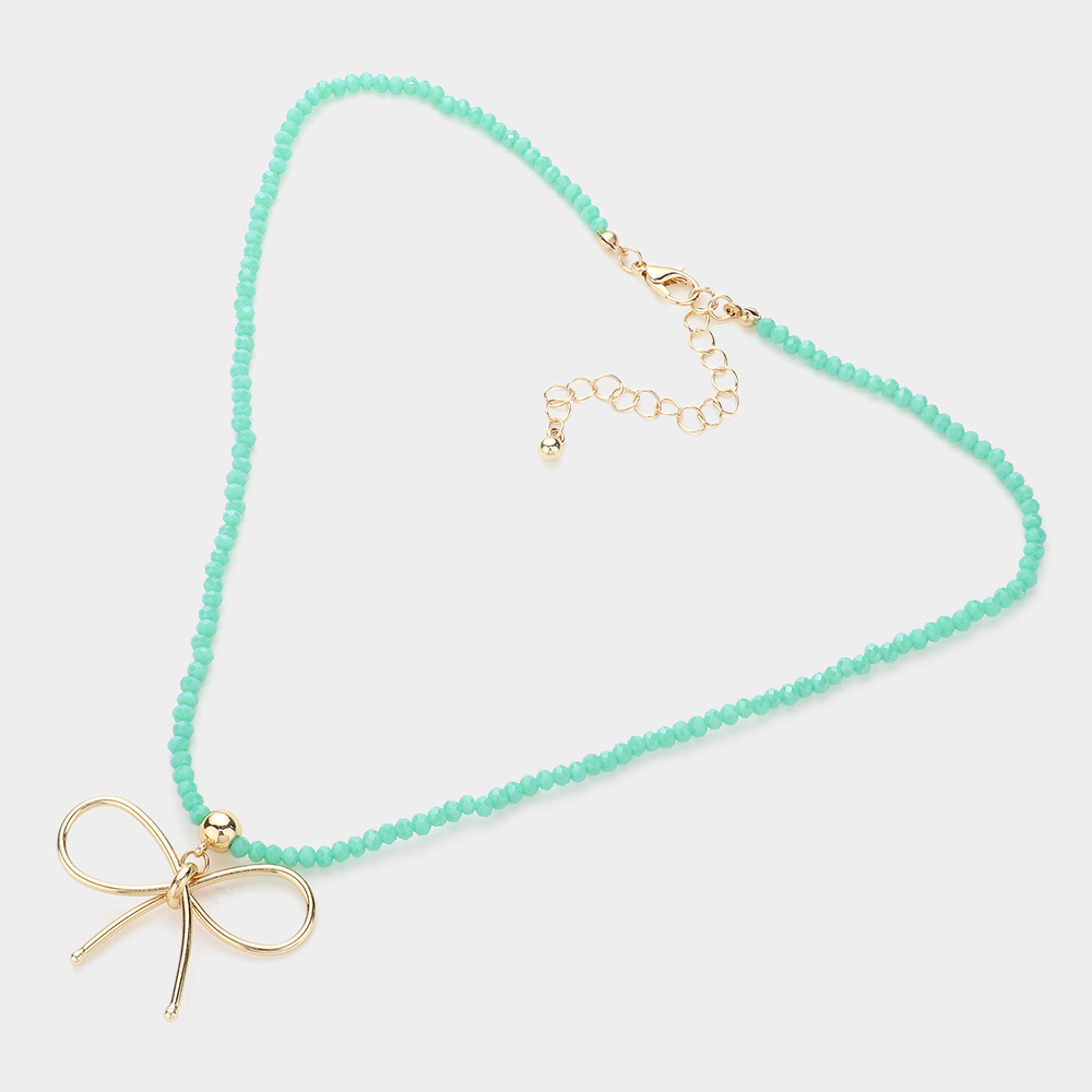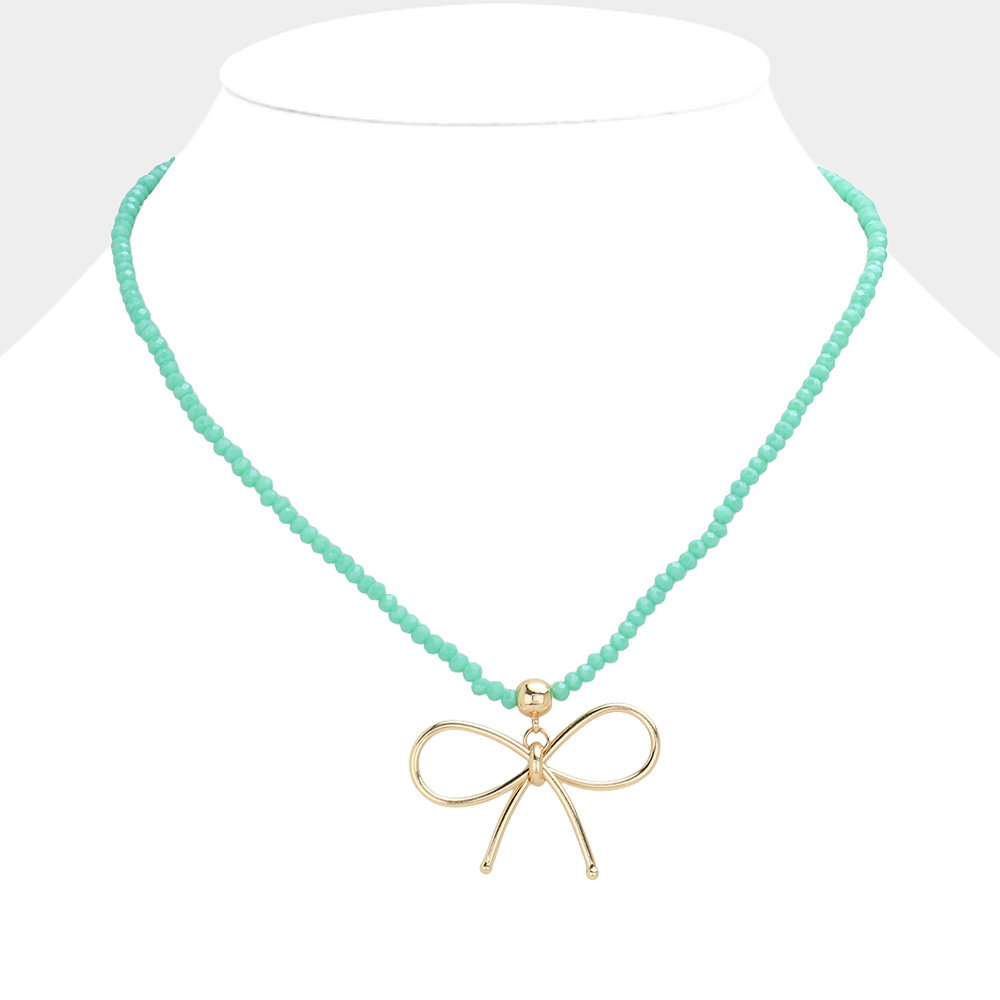 Faceted Beaded Brass Metal Wire Bow Pendant Necklace