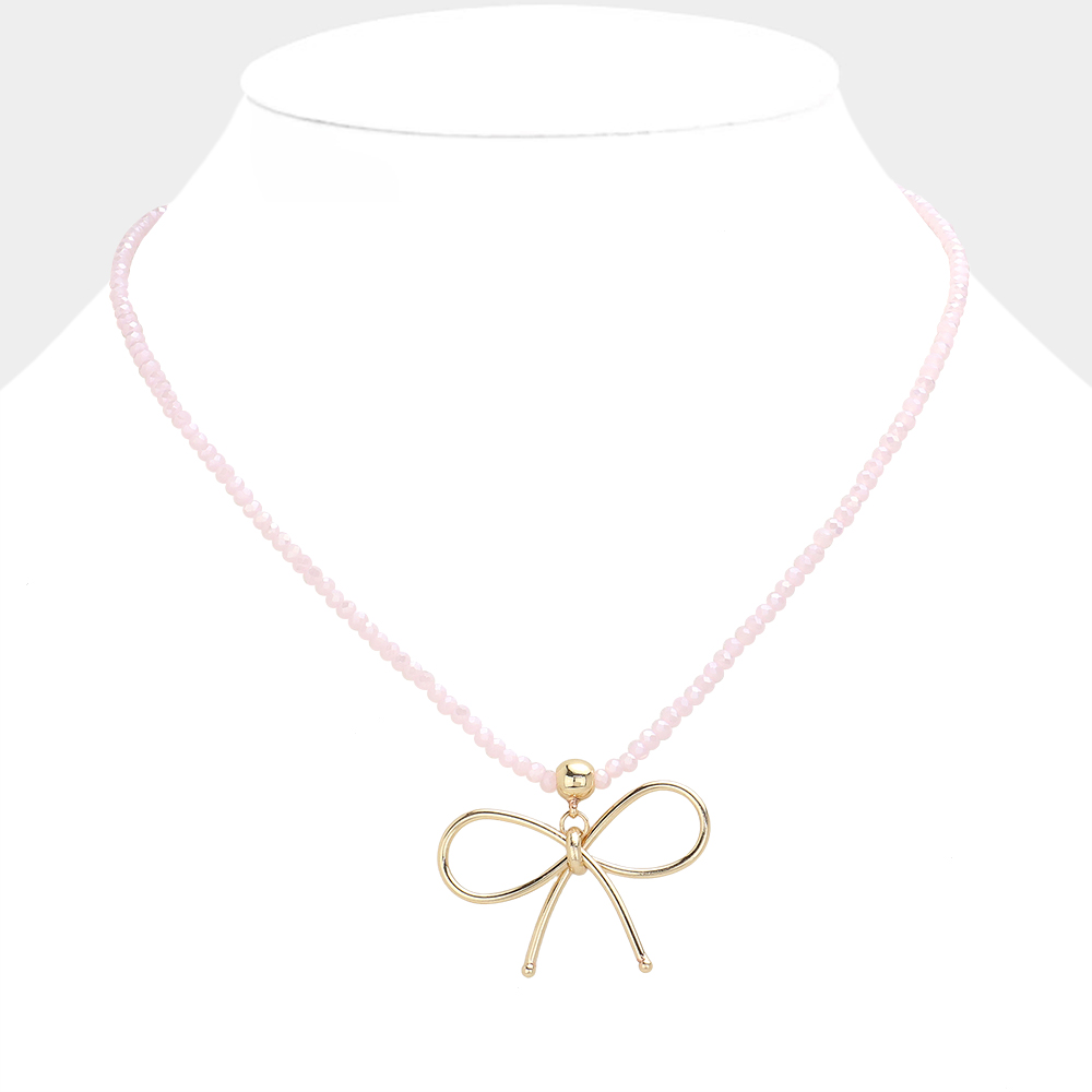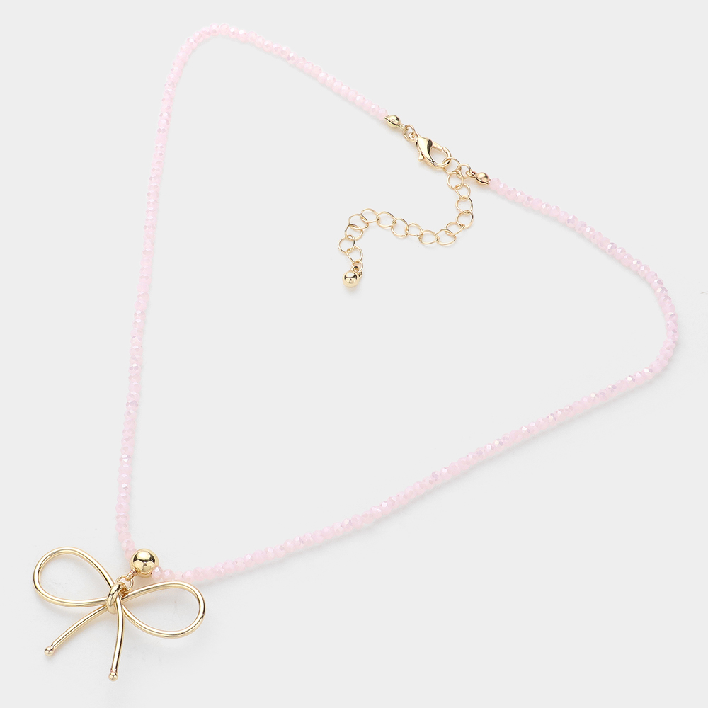 Faceted Beaded Brass Metal Wire Bow Pendant Necklace
