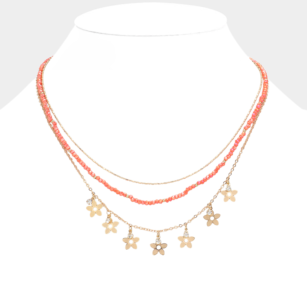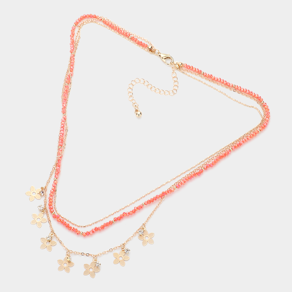 Faceted Beaded Metal Chain Layered Flower Charm Station Necklace