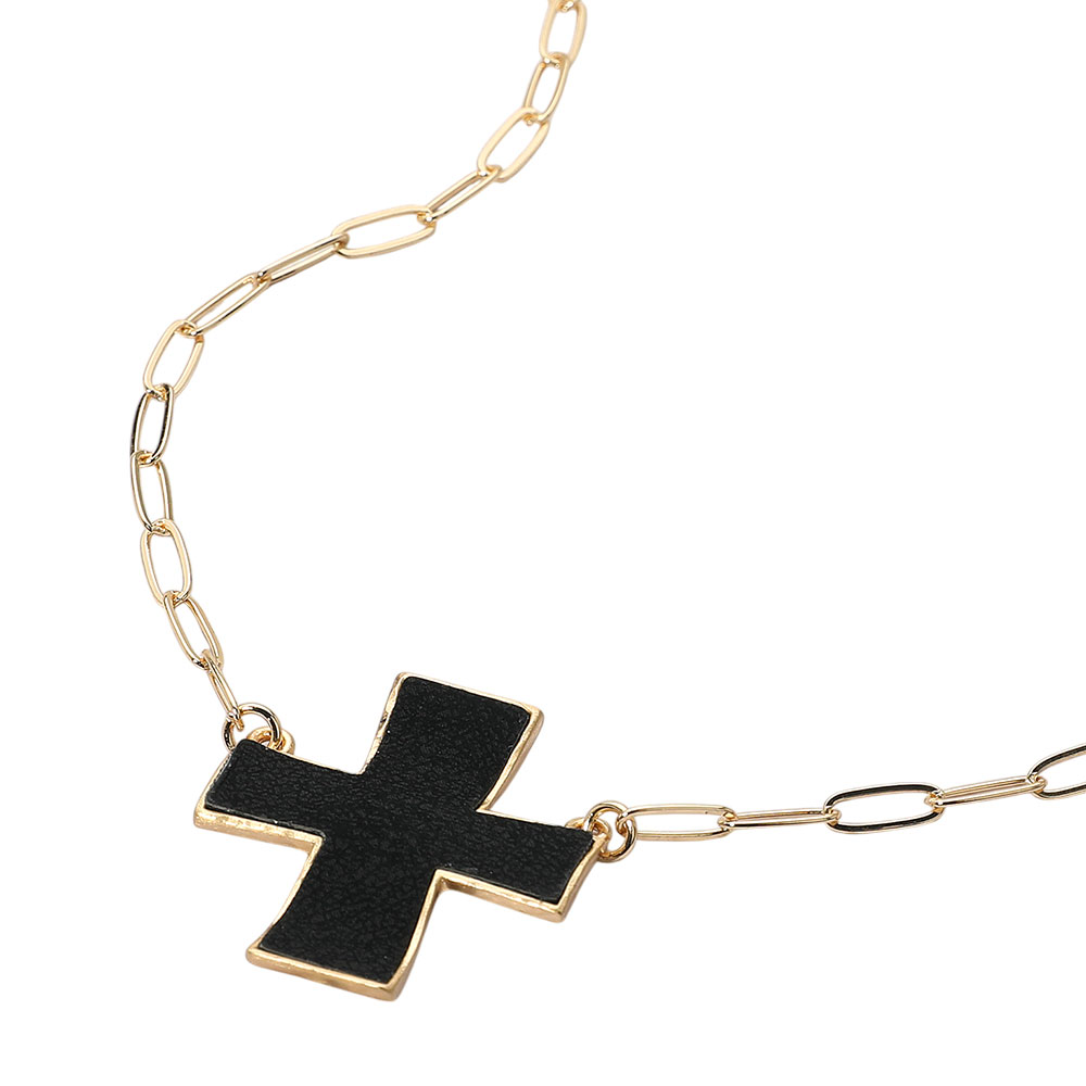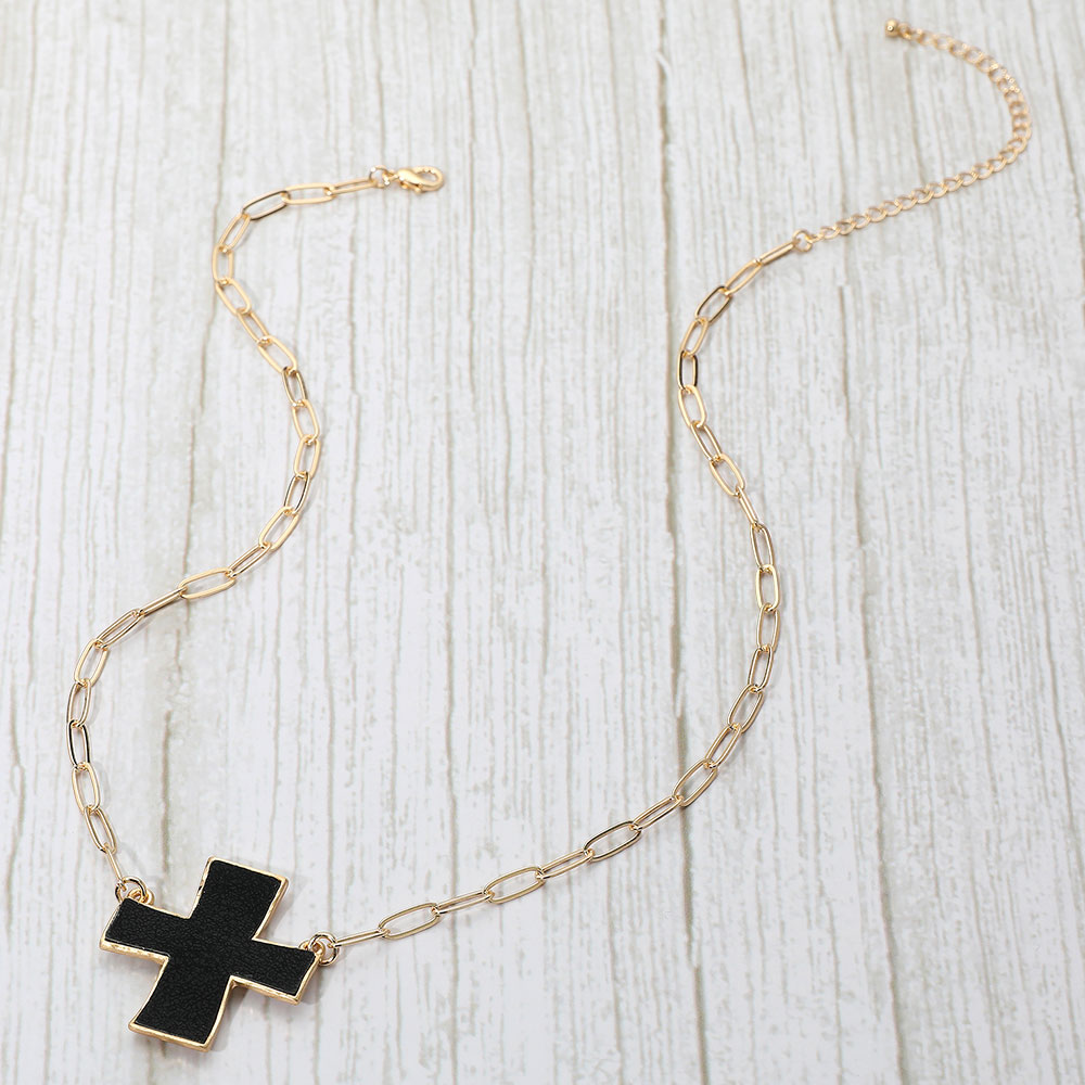 Faux Leather Cross Pendant Paperclip Chain Necklace