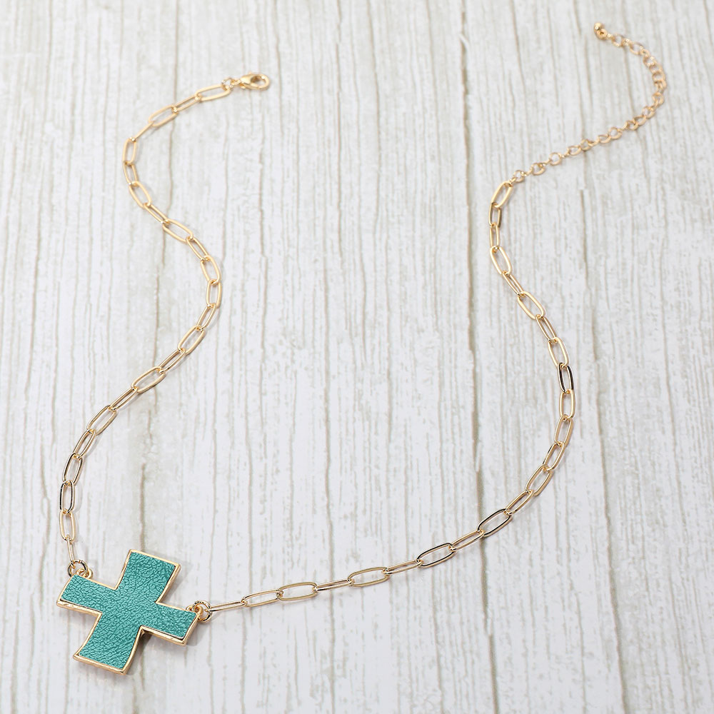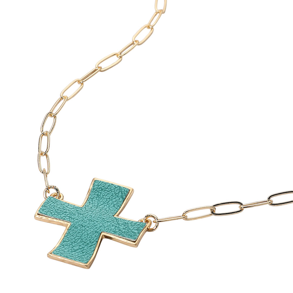 Faux Leather Cross Pendant Paperclip Chain Necklace