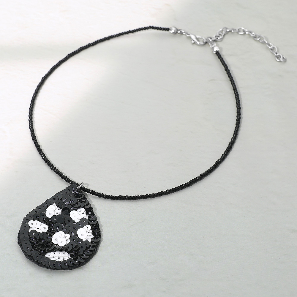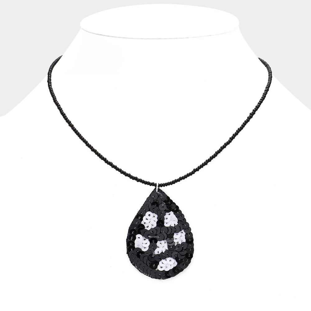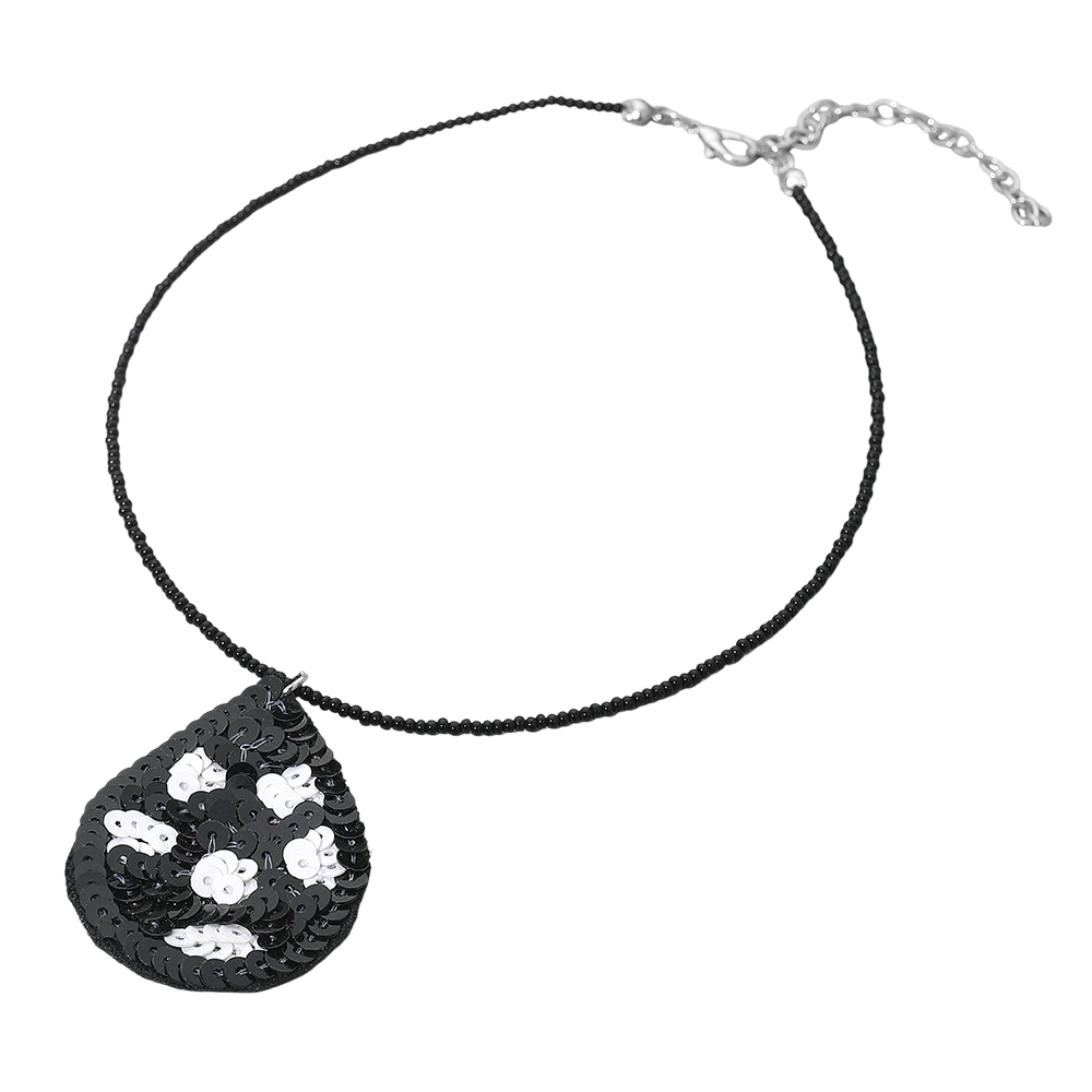 Details • Necklace Size : 14" + 3" L • Pendant Size : 1.3" X 2" • Elegant teardrop pendant necklace featuring a floral sequin design on a delicate beaded chain. Adds a touch of sparkle and charm to any outfit. Perfect for casual or dressy looks, this lightweight statement piece enhances your style with a unique handcrafted appearance. • Lead and Nickel Compliant • Made In India