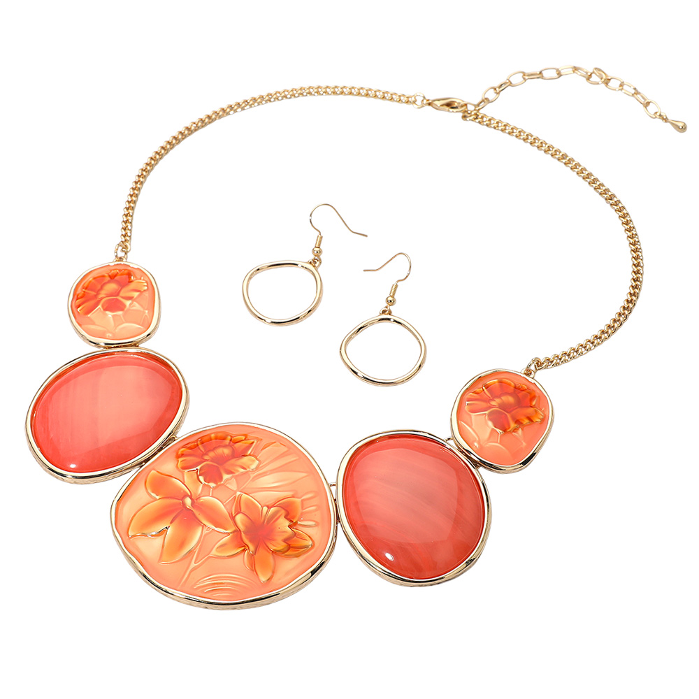 • Elegant statement necklace and earrings set featuring embossed floral designs on smooth, polished oval accents. The sculpted flowers and glossy finish add a touch of sophistication, perfect for enhancing formal outfits or making a bold fashion statement.
