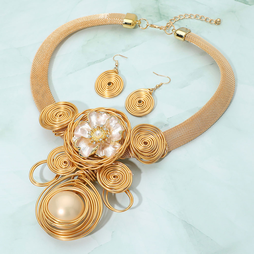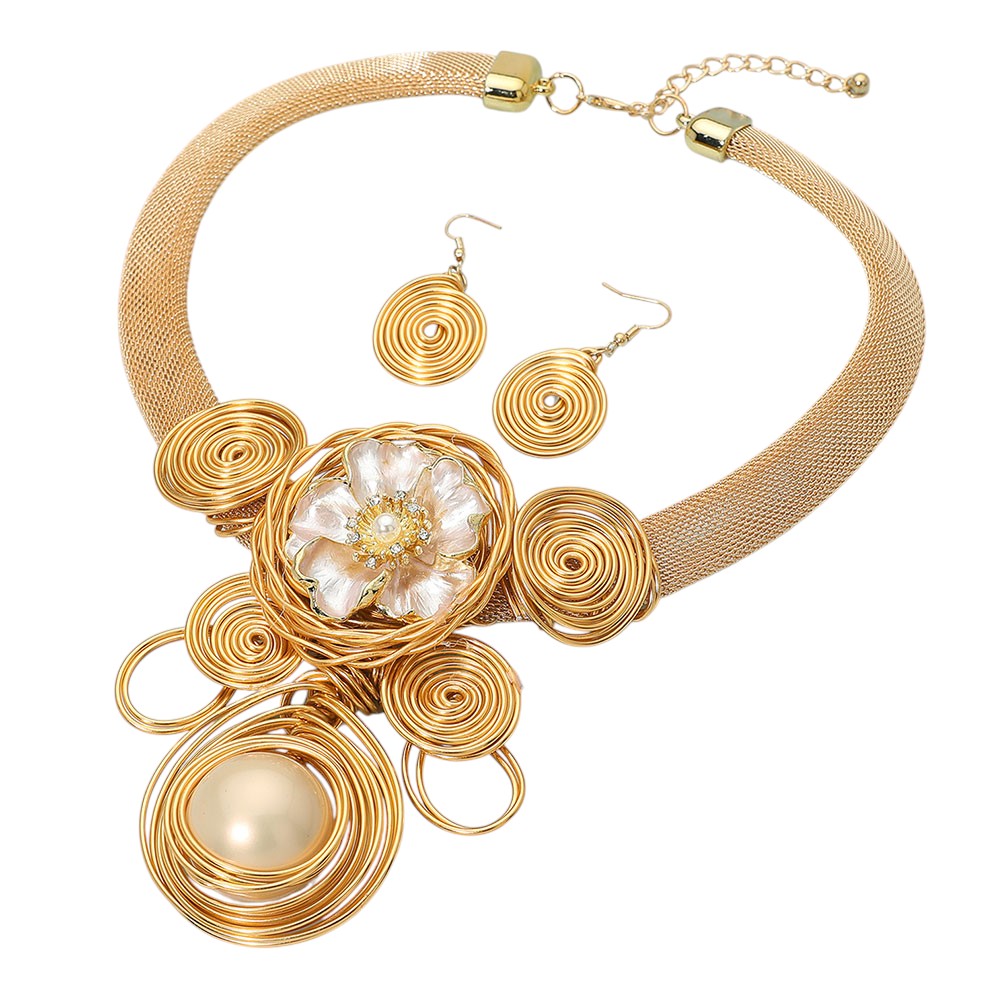 Details • Necklace Size : 18.5" + 3" L • Decor Size : 4.75" L • Earrings Size : 2" L • Make a dramatic impression with this floral spiral statement necklace and matching earrings. The bold spiral design and delicate flower centerpiece blend artistry and elegance, creating a captivating accessory set perfect for special occasions or standout fashion moments. • Lead and Nickel Compliant