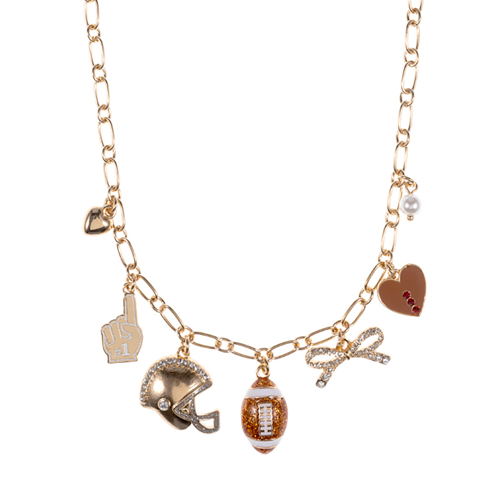 Details • Necklace Size : 16" + 3" L • Decor Size : 1" L • Stylish necklace featuring football-themed charms including a helmet, ball, and fan icons. Perfect accessory for game days, sports fans, or gifting occasions. Adds a fun athletic touch to any outfit. • Lead and Nickel Compliant