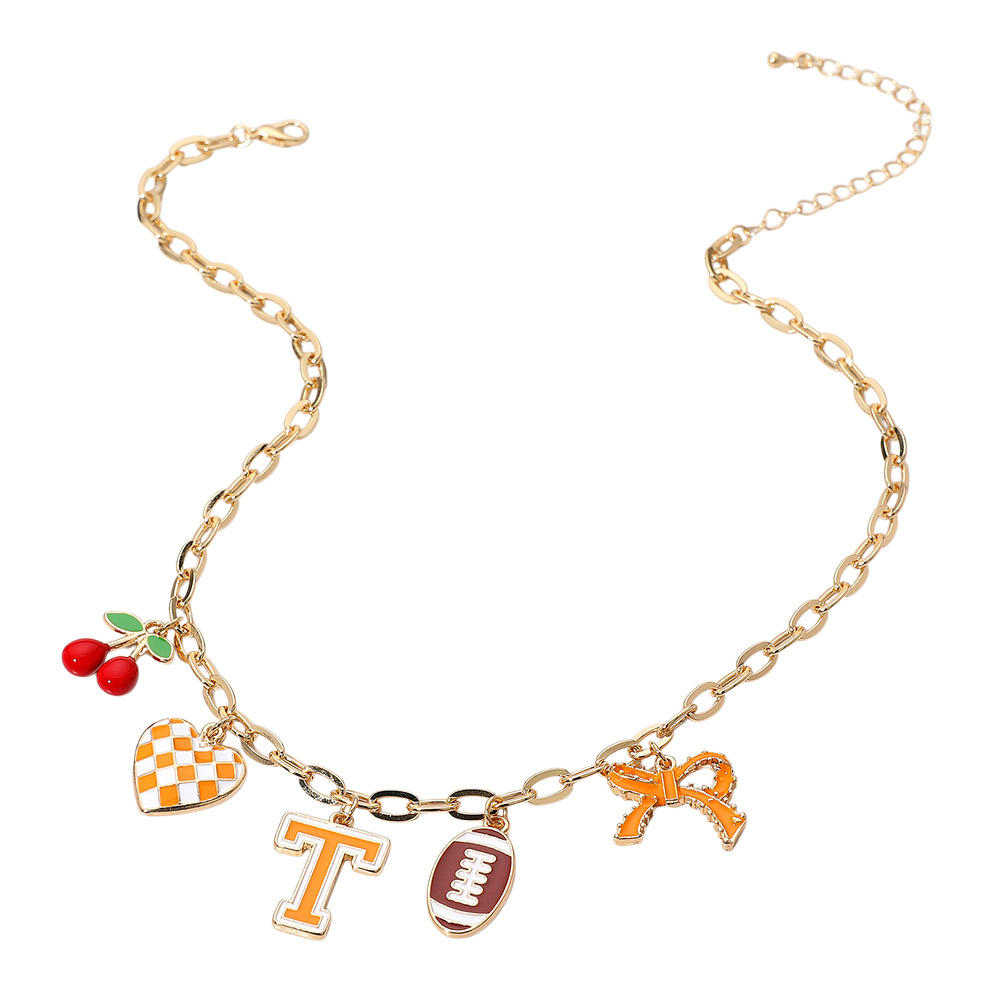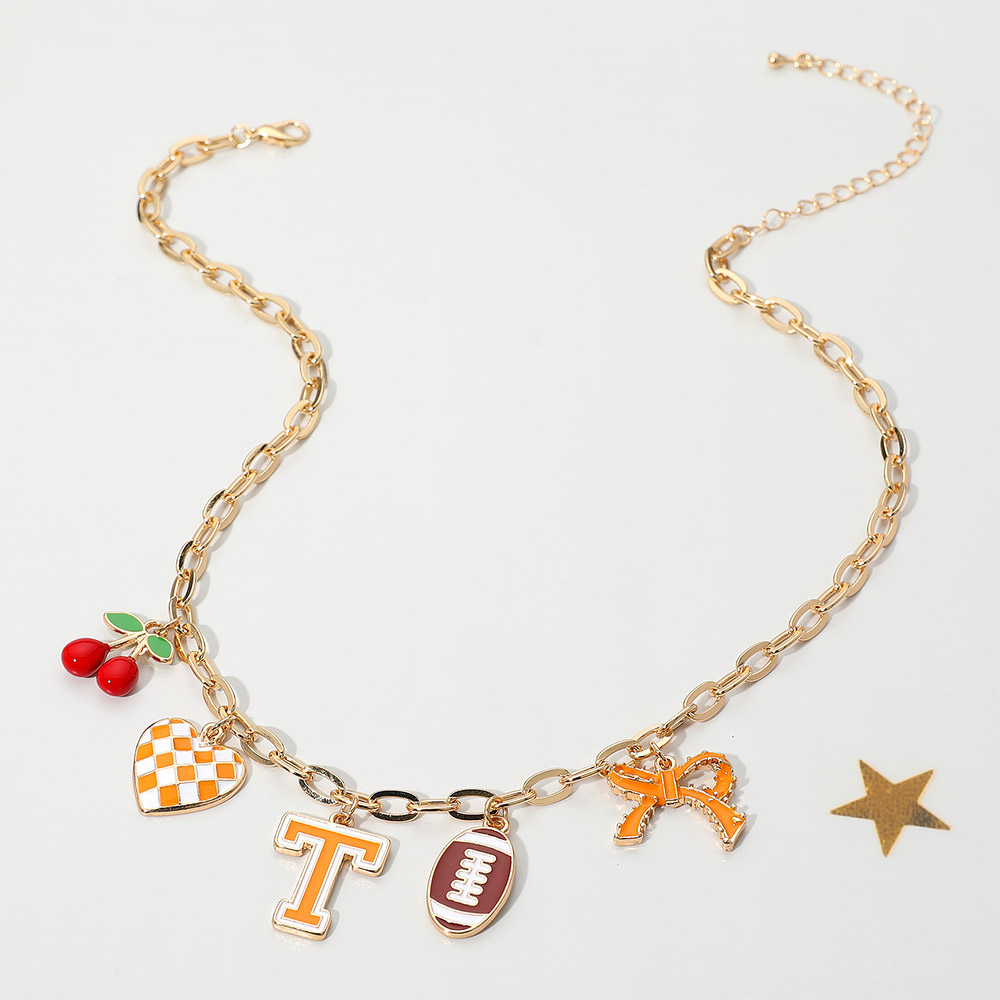 • Trendy chain necklace featuring playful charms including a football, heart, letter, bow, and cherry. A fun accessory to express sporty flair and personality with a unique mix of themed pendants.