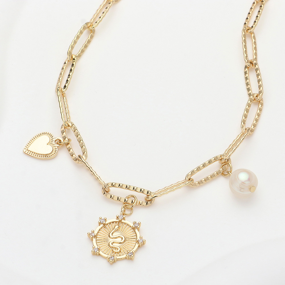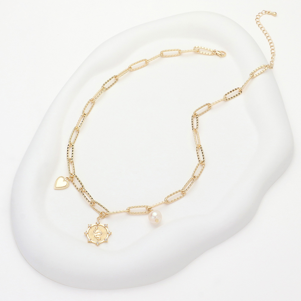 Fresh Water Pearl Snake Token Heart Charm Station Textured Paperclip Chain Necklace