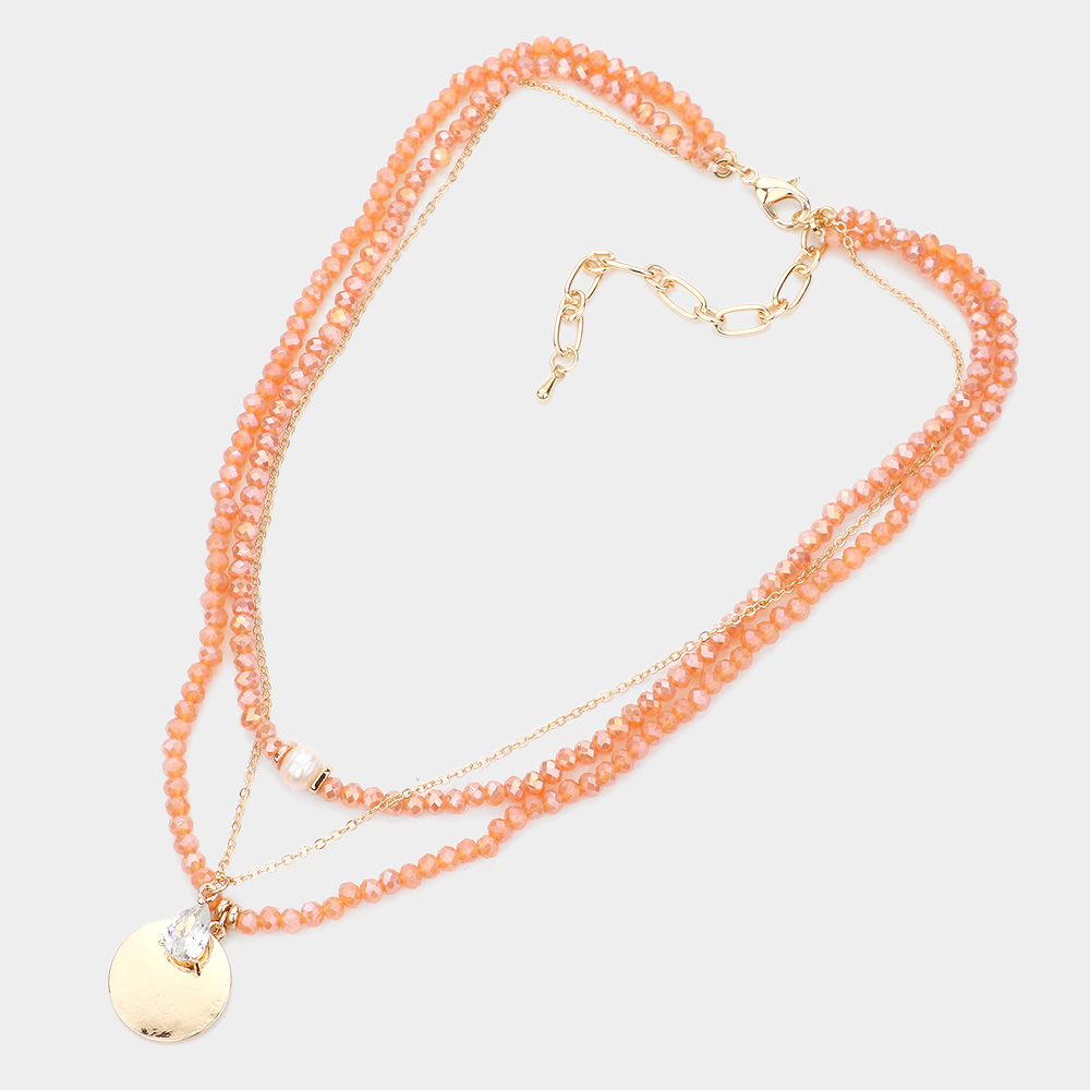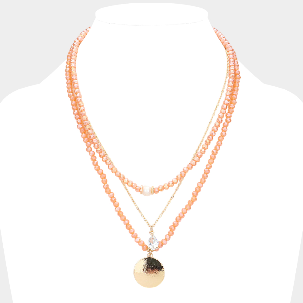 Freshwater Pearl Teardrop Metal Disc Pendant Triple Layered Necklace