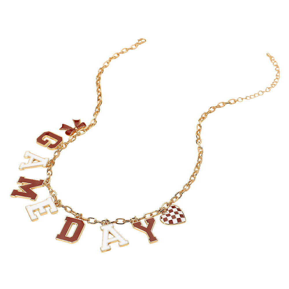 • Celebrate your team spirit with this game day necklace featuring bold letter charms and playful accent pieces. A perfect accessory to complete your spirited outfit for sporting events, tailgates, or fan gatherings.