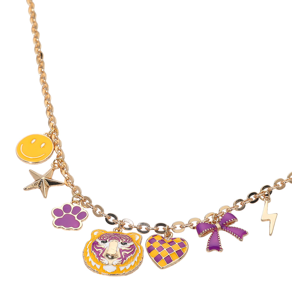 Details • Necklace Size : 18" + 3.25" L • Decor Size : 1.2" L • Necklace featuring playful gameday charms including team mascot animal, paw, heart, bow, star, lightning bolt, and smiley face. A spirited accessory to show team pride, add personality, and complete sporty gameday outfits. • Lead and Nickel Compliant