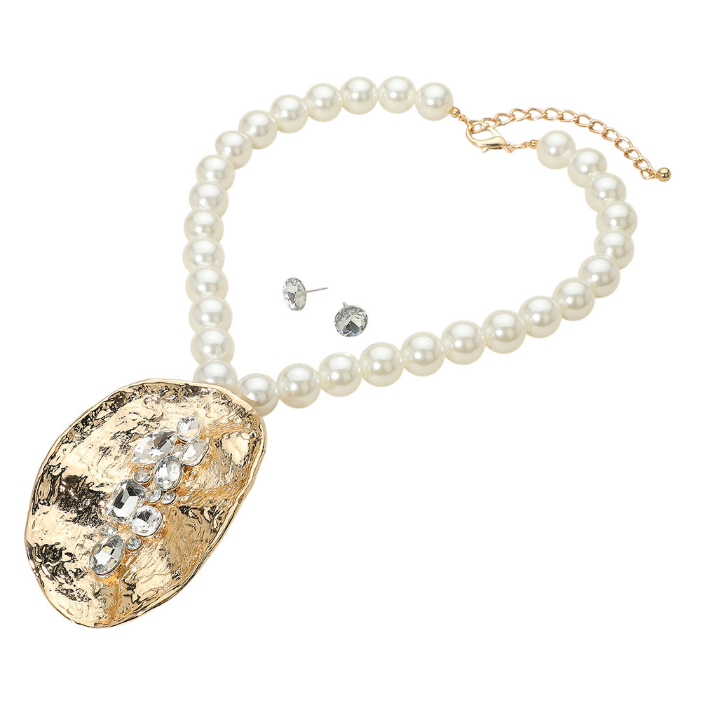 Glass Stone Embellished Hammered Metal Abstract Plate Pendant Accent Chunky Pearl Necklace
