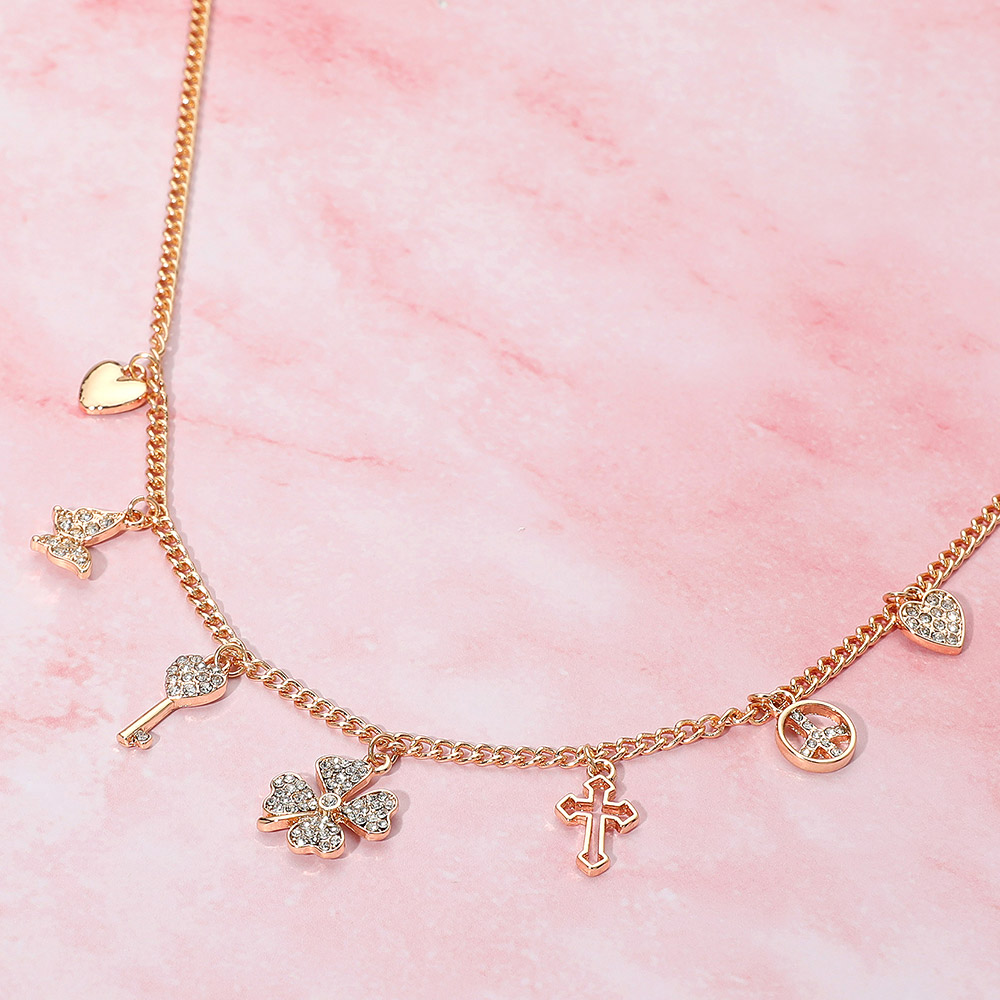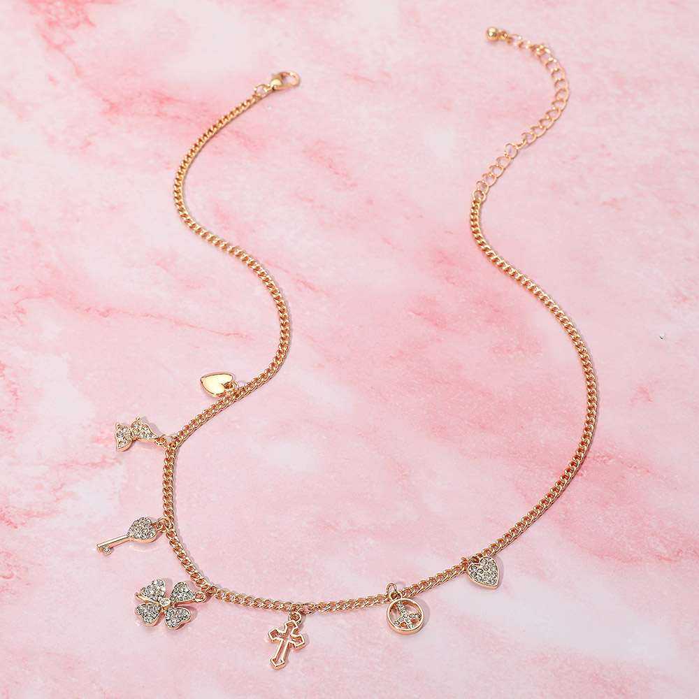Details • Necklace Size : 16" + 3" L • Decor Size : 0.8" L • This necklace features symbolic charm pendants including a bow, key, cross, heart, and peace sign. A meaningful accessory that adds playful elegance and personal flair to any outfit. • Lead and Nickel Compliant • Gold Dipped