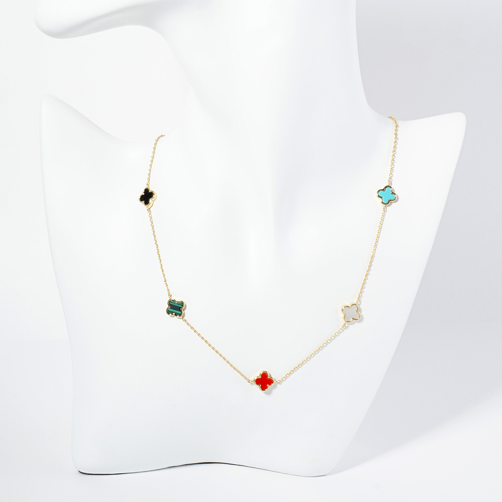• Elegant necklace featuring delicate mini quatrefoil charms evenly spaced along a fine chain. Its timeless and refined design makes it perfect for layering or wearing solo, adding a touch of sophistication and charm to both everyday outfits and special occasions.