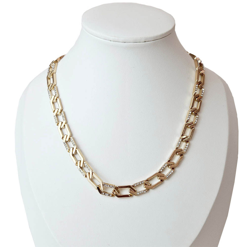 Details • Necklace Size : 16.5" + 3" L • Decor Size : 0.3" L • Stylish geometric chain link necklace adorned with sparkling crystal accents for a modern and elegant look. Adjustable design makes it perfect for layering or wearing solo, adding a chic statement to any outfit. • Lead and Nickel Compliant • Gold Dipped