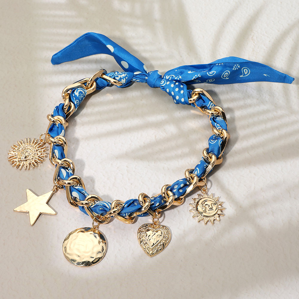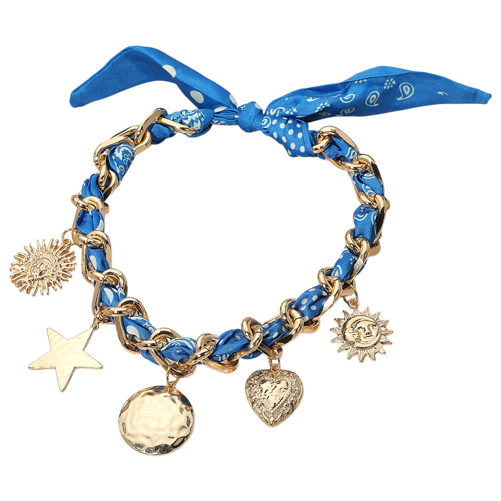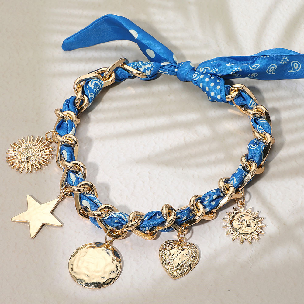 Details • Necklace Size : 25" L • Decor Size : 2" L • Elegant charm necklace adorned with gold-tone pendants including a star, heart, sun, and textured disc. The chain is interwoven with a patterned ribbon for a stylish twist, making it a perfect accessory to elevate casual and dressy outfits with charm and personality. • Lead and Nickel Compliant