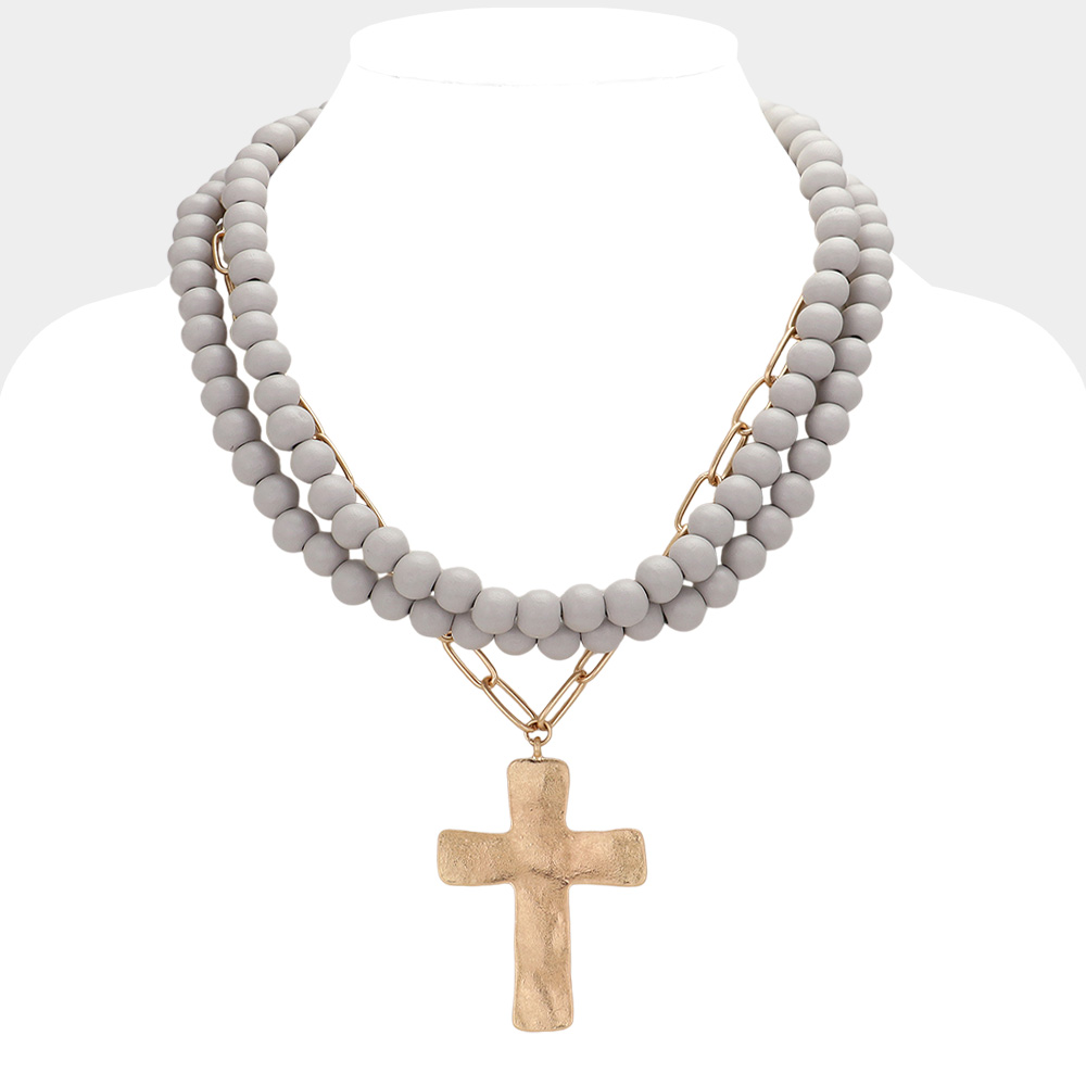 Hammered Metal Cross Pendant Wood Paperclip Chain Layered Necklace