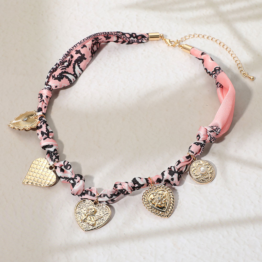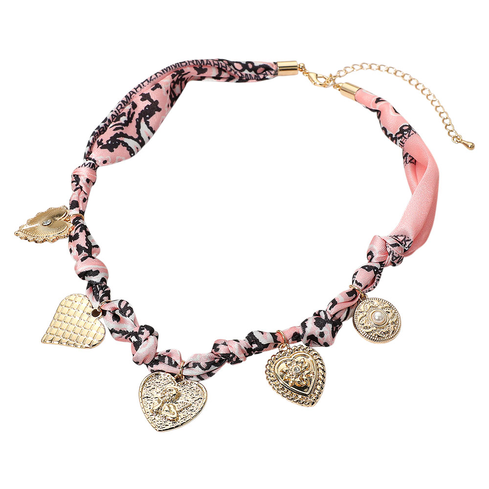 • Stylish fabric-wrapped necklace adorned with gold-tone heart and coin charms. A fashionable statement piece that blends elegance and trend for any occasion.