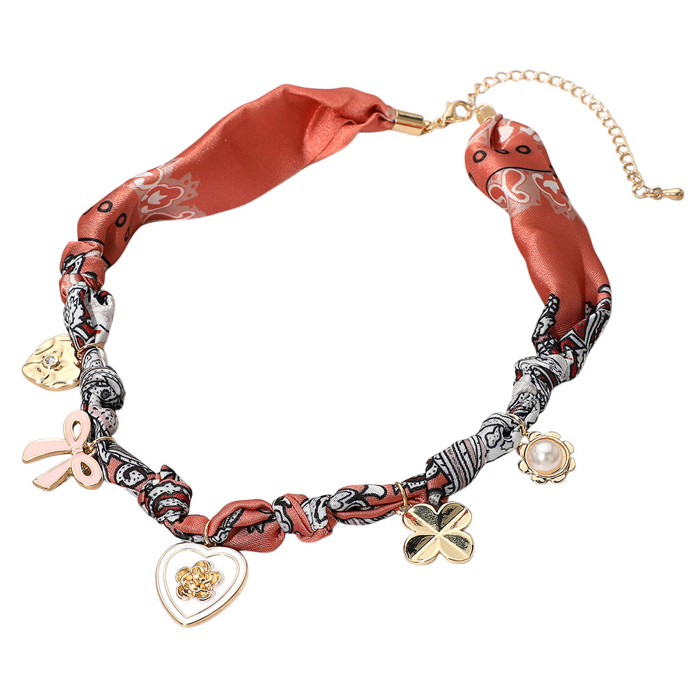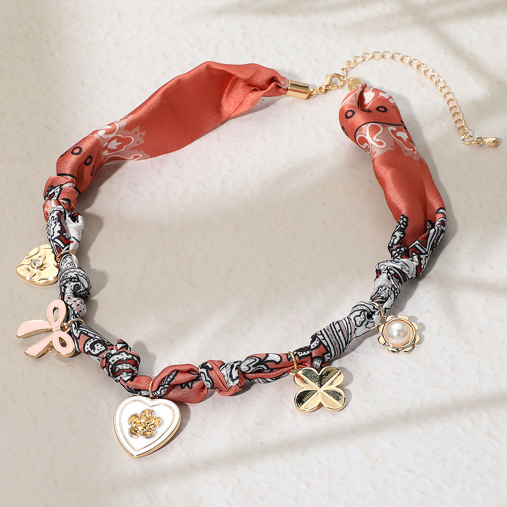 Details • Necklace Size : 16" + 3" L • Decor Size : 1" L • Charming fabric-wrapped necklace adorned with gold-tone heart, bow, clover, and floral charms. A playful and elegant accessory that adds a unique touch to your look. • Lead and Nickel Compliant