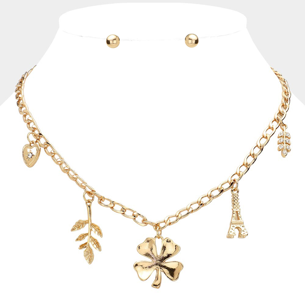 Heart Leaf Clover Eiffel Tower Pendant Station Necklace