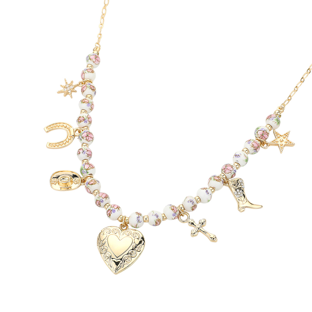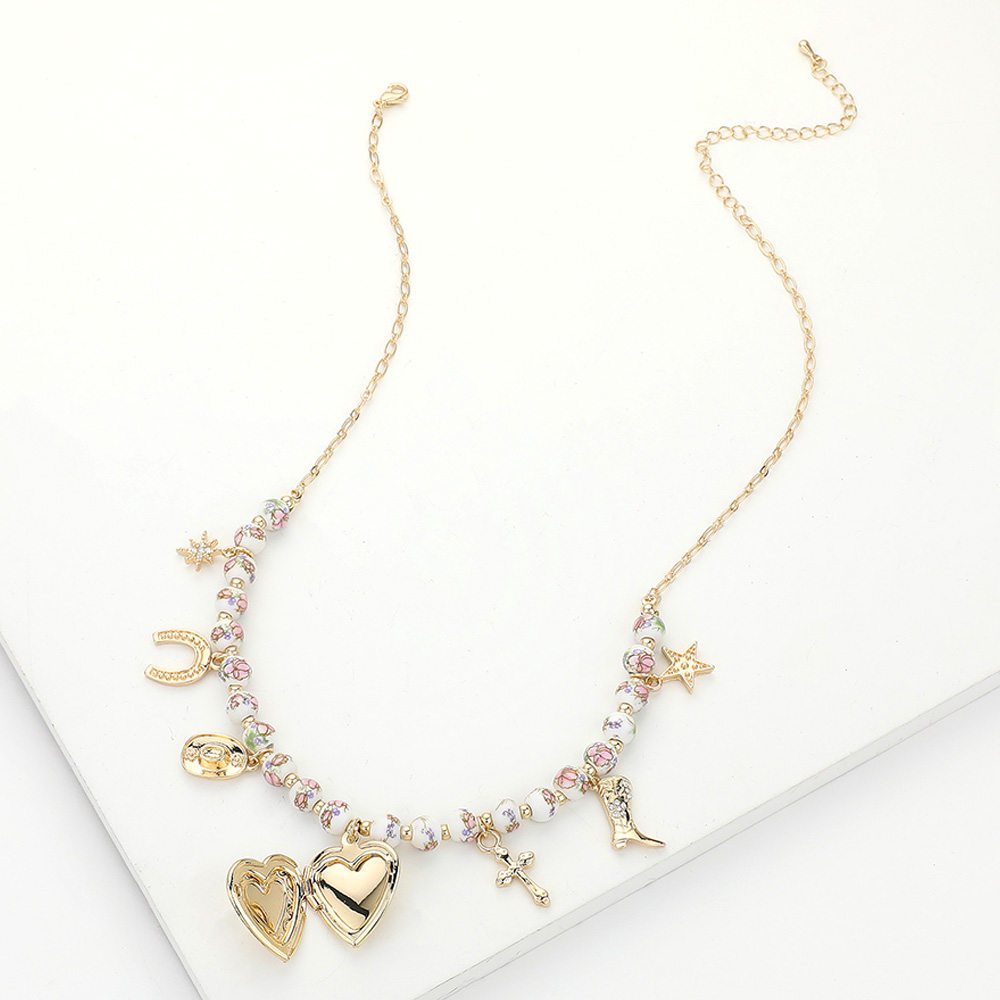 Details • Necklace Size : 16" + 3.5" L • Decor Size : 1" L • Playful charm necklace featuring a heart, star, cross, horseshoe, and boot pendants with sparkling beaded detailing. Ideal for layering or wearing solo, this piece adds whimsical elegance to everyday or themed outfits. • Lead and Nickel Compliant