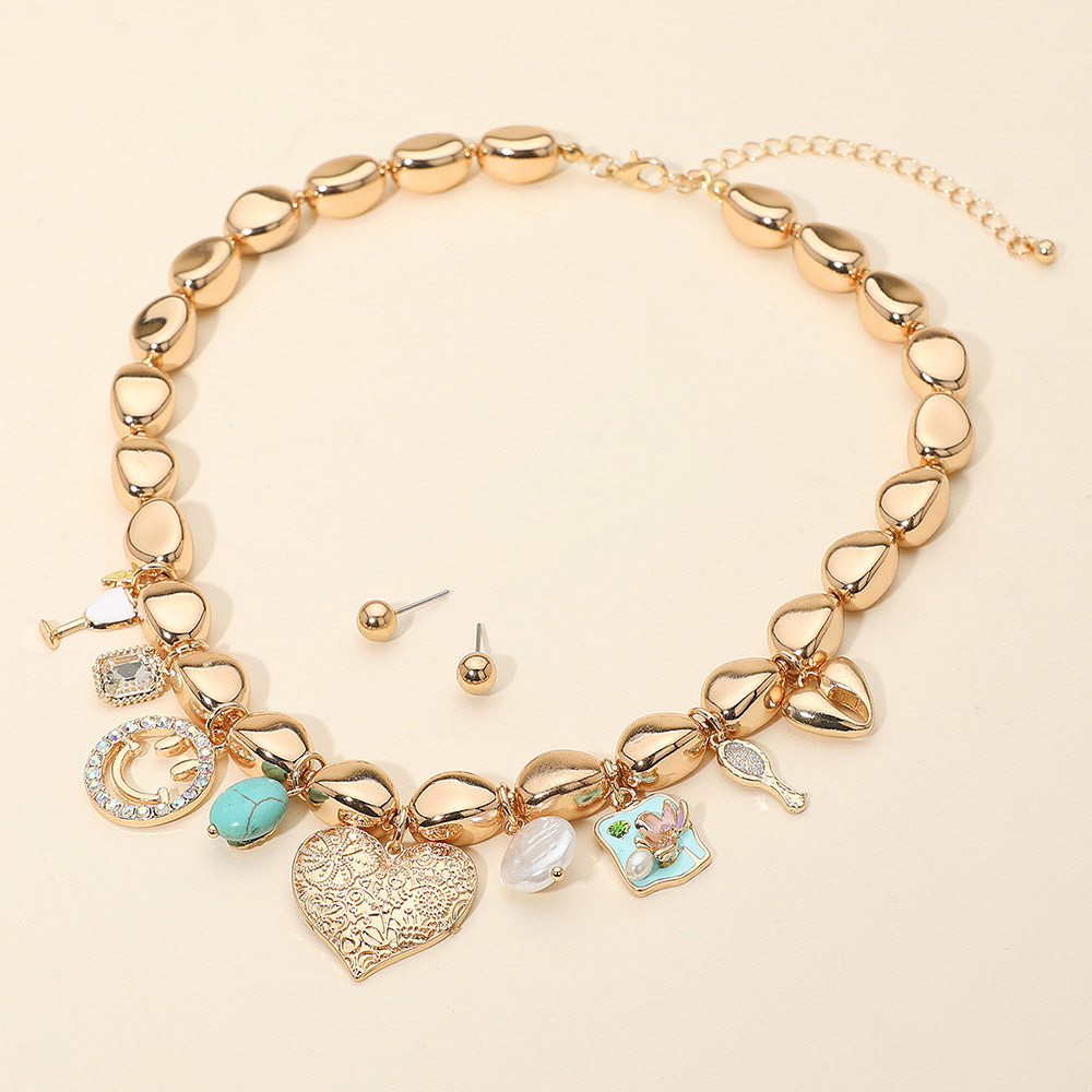 Details • Necklace Size : 16" + 3" L • Decor Size : 1.25" L • Earrings Size : 0.25" L • Elevate your look with this playful beaded necklace featuring a collection of charming pendants that add personality and style to any outfit. Paired with simple stud earrings, this set blends elegance and fun, making it perfect for casual wear, special events, and unique statement looks. • Lead and Nickel Compliant
