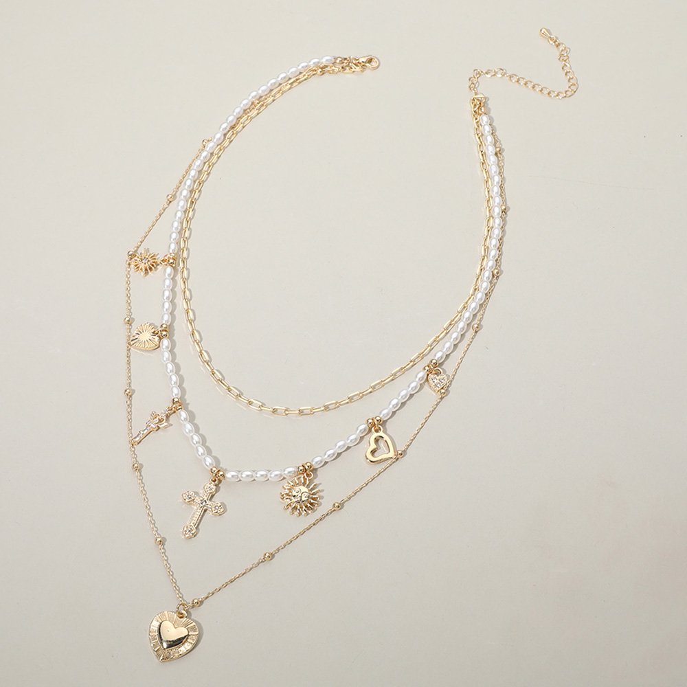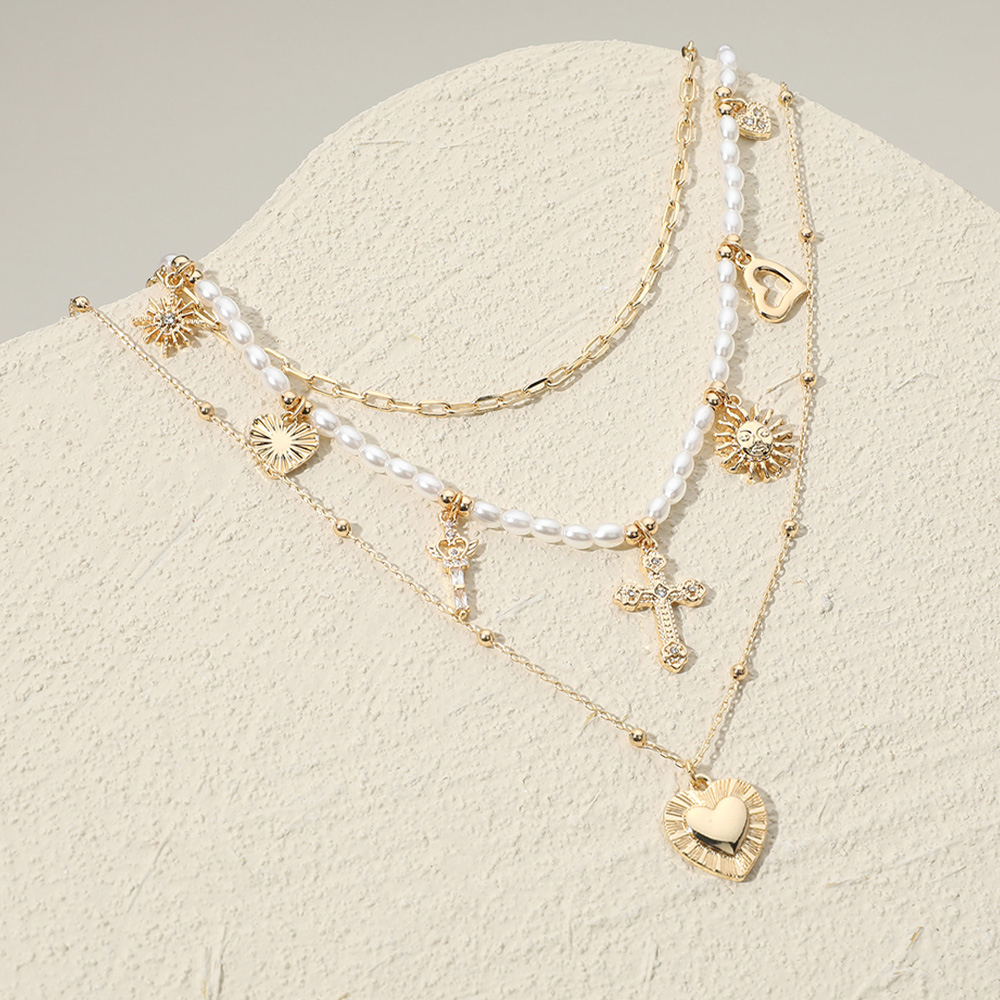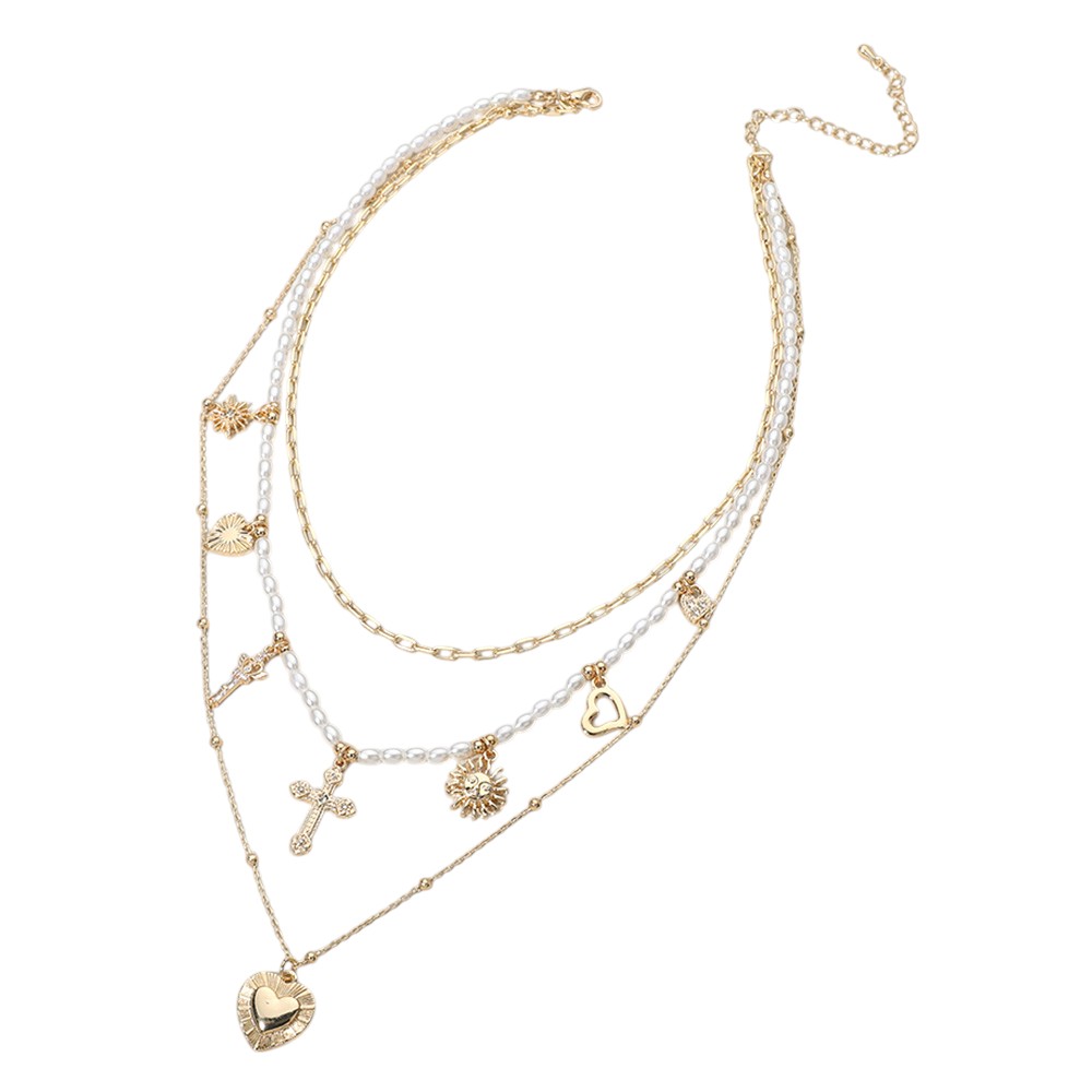 Heart Pendant Cross Sun Star Charm Station Pearl Chain Layered Necklace