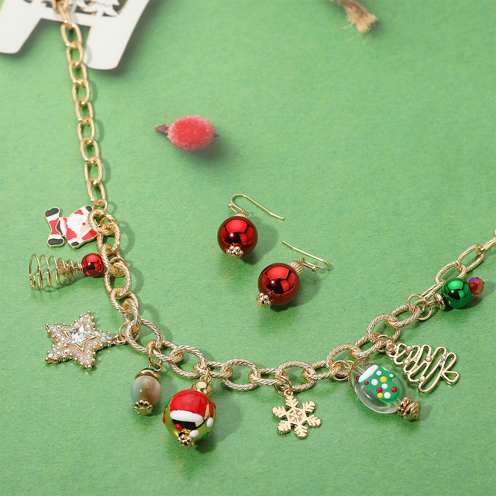 Details • Necklace Size : 18" + 3" L • Decor Size : 1.75" L • Earrings Size : 1.5" L • Festive holiday jewelry set featuring a charm necklace with seasonal motifs and matching drop earrings. A playful, statement-making accessory perfect for parties, gifting, and adding cheerful sparkle to your celebration looks. • Lead and Nickel Compliant