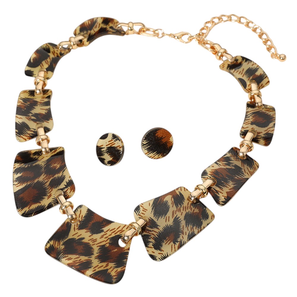 Details • Necklace Size : 17" + 3.5" L • Decor Size : 1.25" L • Earrings Size : 0.75" L • Leopard print necklace and earring set designed to make a fierce statement. Featuring bold patterned links paired with matching studs, this jewelry set adds a striking touch of style, perfect for parties, evening events, or elevating everyday outfits with a confident, fashion-forward edge. • Lead and Nickel Compliant