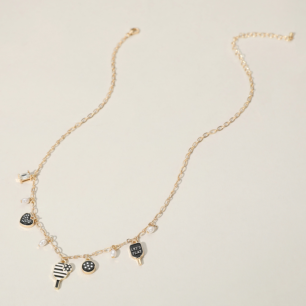 Details • Necklace Size : 16" + 3.2" L • Decor Size : 0.75" L • Whimsical charm necklace featuring fun pickleball-themed pendants and delicate details. A light chain displays heart, ball, paddle, and other sporty icons. Perfect for casual wear or gifting fans. • Lead and Nickel Compliant