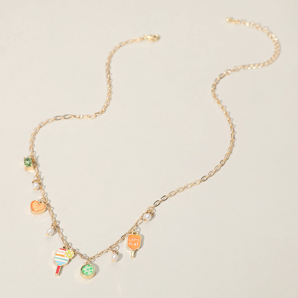 Details • Necklace Size : 16" + 3.2" L • Decor Size : 0.75" L • Whimsical charm necklace featuring fun pickleball-themed pendants and delicate details. A light chain displays heart, ball, paddle, and other sporty icons. Perfect for casual wear or gifting fans. • Lead and Nickel Compliant