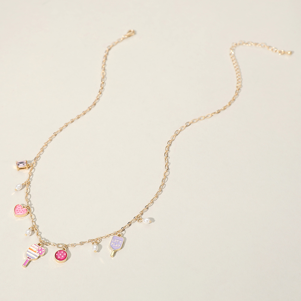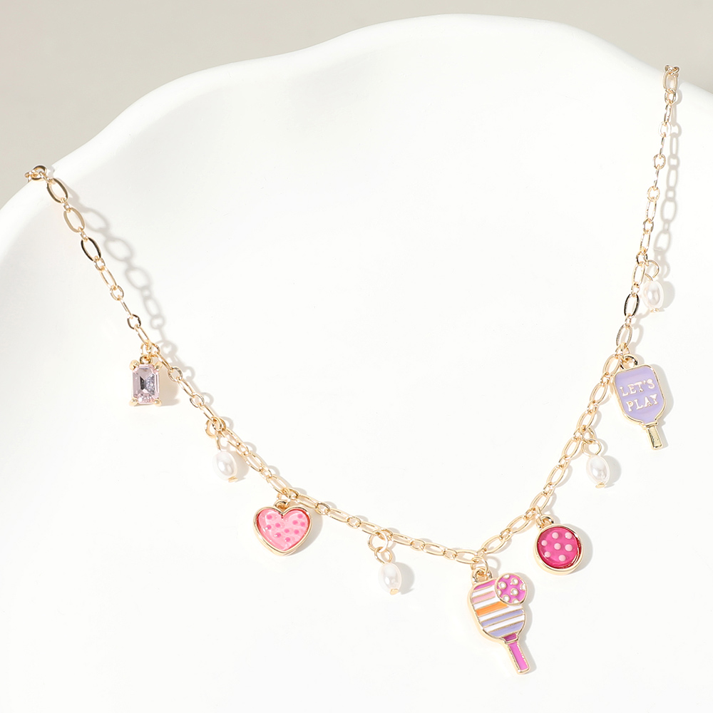 Details • Necklace Size : 16" + 3.2" L • Decor Size : 0.75" L • Whimsical charm necklace featuring fun pickleball-themed pendants and delicate details. A light chain displays heart, ball, paddle, and other sporty icons. Perfect for casual wear or gifting fans. • Lead and Nickel Compliant