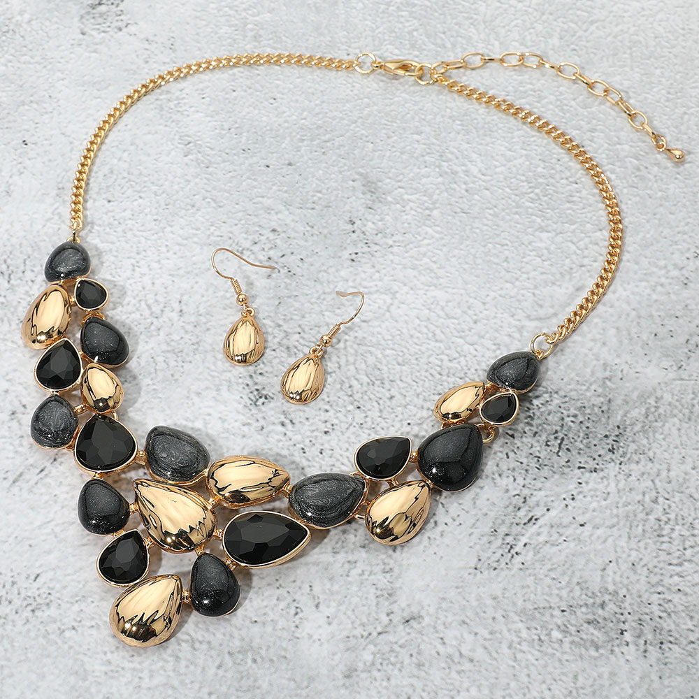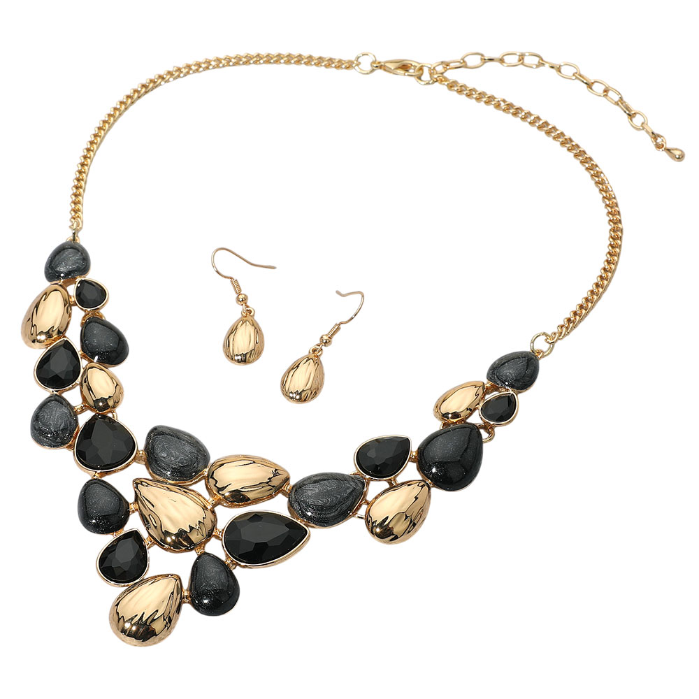 • Bold necklace and earring set featuring teardrop-shaped accents and sparkling stones. Perfect for elevating formal attire or adding glamour to special occasions.