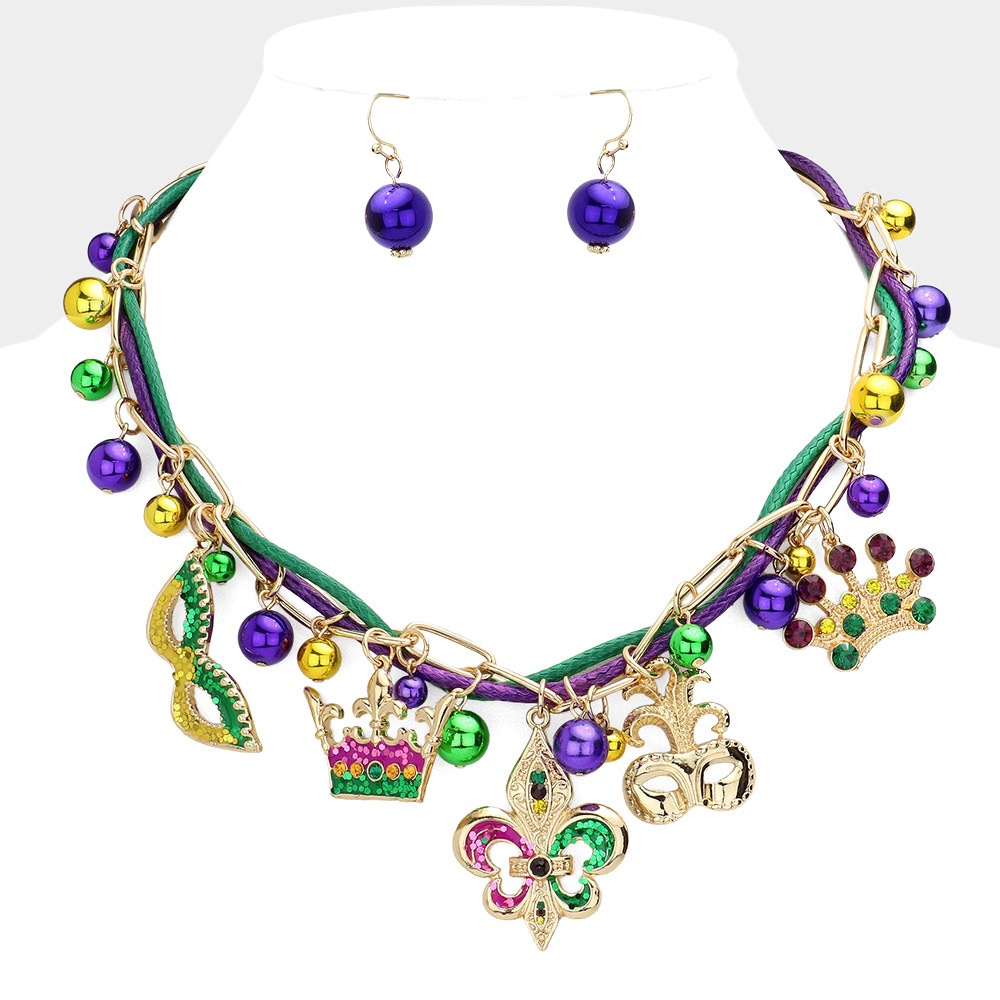 Mardi Gras Fleur de Lis Mask Crown Pendant Thread Station Necklace
