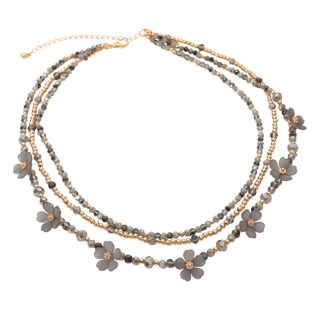 Details • Necklace Size : 15.5" + 3" L • Decor Size : 2" L • Embrace elegance with this layered floral beaded necklace. Featuring delicate multi-strand design with shimmering beads and petite flower accents, it adds a playful yet refined touch to any ensemble—perfect for both casual charm and special occasions. • Lead and Nickel Compliant